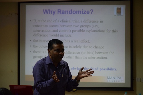 The third session in the forenoon was on Randomization process and techniques for RCT by Dr. B Unnikrishnan, Associate Dean, KMC Mangalore. He highlighted the importance of randomization, various ways of reporting the techniques used while writing & publishing articles.