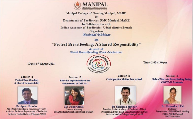 As part of World Breastfeeding Week -2021, Manipal College of Nursing, Manipal, Manipal Academy of Higher Education (MAHE) and Department of Paediatrics, Kasturba Medical College (KMC), Manipal, MAHE, in collaboration with Indian Academy of Paediatrics, Udupi District Branch, organized a National Webinar on 5 August 2021, virtually in MS Teams platform between 2.00 and 4.30 pm for the students, staff nurses and faculty of MAHE and other institutions across the state and country. The theme for the webinar was: “Protect Breastfeeding: A Shared Responsibility.”