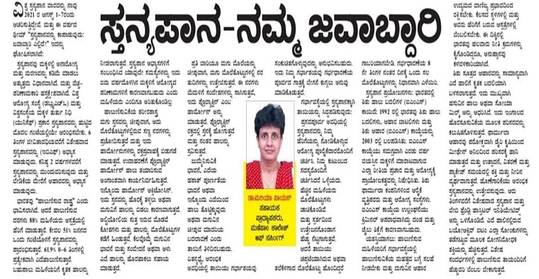 Articles on Breastfeeding in the Kannada Newspaper: To create awareness and emphasize the importance of breastfeeding, articles were published in the local newspaper, Udayavani, on August 1st. The informative articles were written by Dr Baby S Nayak, Professor and HOD, and Dr Yashoda S, Assistant Professor, Child Health Nursing Department, and article on Breastfeeding: Our responsibility in Sanjeprabha newspaper, Bangalore was written by Dr Maria Pais, Assistant Professor, Department of OBG nursing.