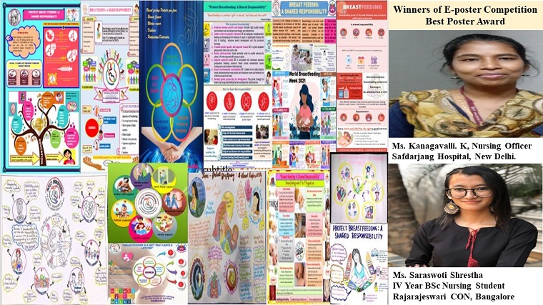 E-poster Competition for Faculty and Students: The competition was open to all faculty and students across the participating institutions. Posters were invited on the theme, “Protect Breastfeeding: A Shared Responsibility.” Nearly 45 contestants from 14 institutions across India and abroad submitted their e-posters. The posters were scrutinized by two judges, and the best two posters were awarded. The winners were: Ms Kanagavalli. K, Nursing Officer, Safdarjung Hospital, New Delhi and Ms Saraswoti Shrestha, IV Year BSc Nursing student, Rajarajeswari College of Nursing, Bangalore. All the participants received a participation certificate in recognition of their effort.