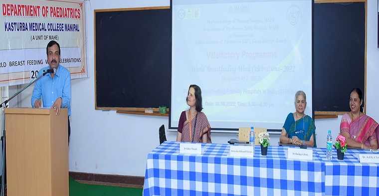 The valedictory program of the World Breastfeeding Week celebration was held on 6th August 2022. Dr. Leslie Lewis, HoD, Pediatrics, KMC, Manipal welcomes the gathering. Emphasizing breastfeeding, he said, breastfeeding should be promoted every day in clinical practice. Dr. Binu Margaret gave an overview of the activities of World breastfeeding week 2022. The Chief Guest of the program, Dr. Pushpa G Kini, Professor, Department of Pediatrics, KMC, Manipal addressing the gathering, said breastfeeding helps in bonding and reduces the risk of diabetic mellitus and uterine cancers in mothers. She said breastfeeding is the best food for babies, it improves their intelligence and social skills, and lowers the risk of coronary heart disease. She called the health care professionals to be the ambassadors to promote and support breastfeeding. She congratulated the team for the excellent organization of the program. Dr. Judith A Noronha, Dean of MCON, in her address said that breastfeeding is a natural phenomenon and it is important to support working mothers to breastfeed their babies. She stressed the importance of breast assessment during the antenatal period to avoid breastfeeding related problems in the later stage. She highlighted the importance of breast crawl and latching and focused on the need for continued education and support for the mothers. She also congratulated the team on the success of the program.
