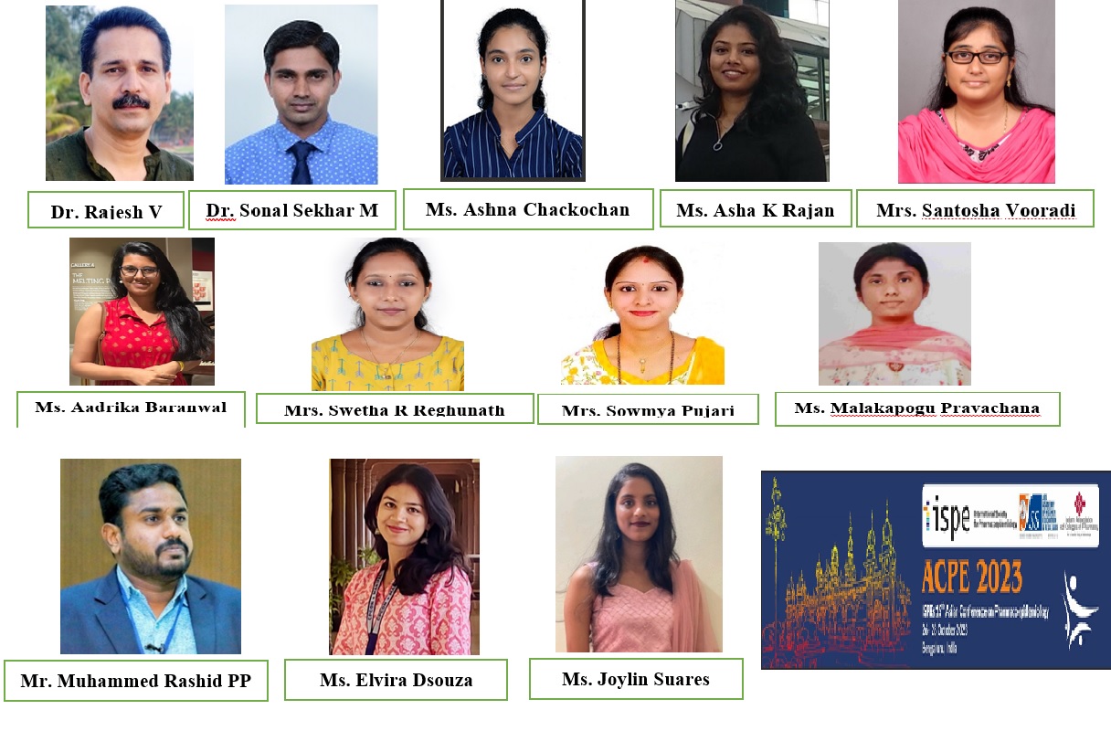 Dr. Rajesh V, Associate Professors; and Dr Sonal Sekhar M, Assistant Professor-Selection Grade of Department of Pharmacy Practice, MCOPS received International Society for Pharmacoepidemiology (ISPE)’s partial scholarship to attend the ISPE's 15th Asian Conference on Pharmacoepidemiology (ACPE), during 26 - 28 October 2023 at Sheraton Grand, Bengaluru, Karnataka. Ms Ashna Chackochan, Ms Asha K Rajan, and Mrs Santosha Vooradi (Research Scholars) and Ms Aadrika Baranwal (Pharm D Intern) received full scholarship. Mrs Swetha R Reghunath, Mrs Sowmya Pujari, Ms Malakapogu Pravachana, Ms Harsimran Kaur, Ms Shravya C, Ms Shwetha Somakumar, Ms Irene Lalhruaimawii, Mr Muhammed Rashid PP (Research Scholars) and Ms Elvira Dsouza & Ms Joylin Suares (Pharm D Interns) received partial scholarship. ISPE’s full scholarship covers one-year membership of ISPE, travel expense and complimentary registration fees to attend the conference, whereas partial scholarship covers one-year membership of ISPE and complimentary registration fees to attend the conference.