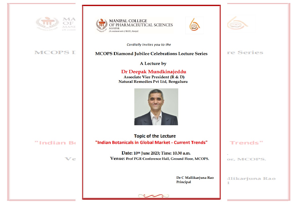 MCOPS DJC Lecture on "Indian Botanicals in Global Market - Current Trends" by Dr Deepak Mundkinajeddu, Associate Vice President (R & D) Natural Remedies Pvt Ltd, Bengaluru