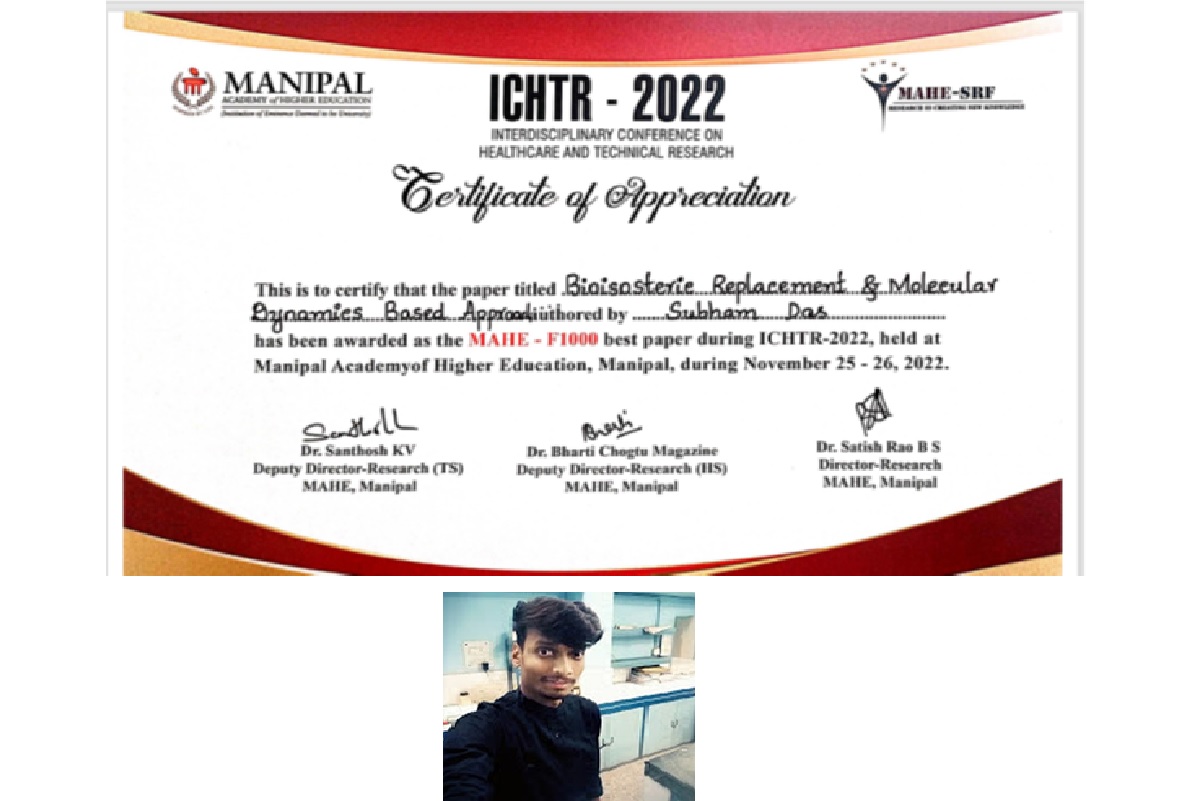 Mr Subham Das, PhD scholar who works under the guidance of Dr. Alex Joseph, Department of Pharmaceutical Chemistry, MCOPS received the “Best Paper award” for the topic entitled “Bioisosteric Replacement & Molecular Dynamics Based Approach” at the Interdisciplinary Conference on Healthcare and Technical Research (ICHTR-2022), held at MAHE, Manipal, India during 25-26 November, 2022.