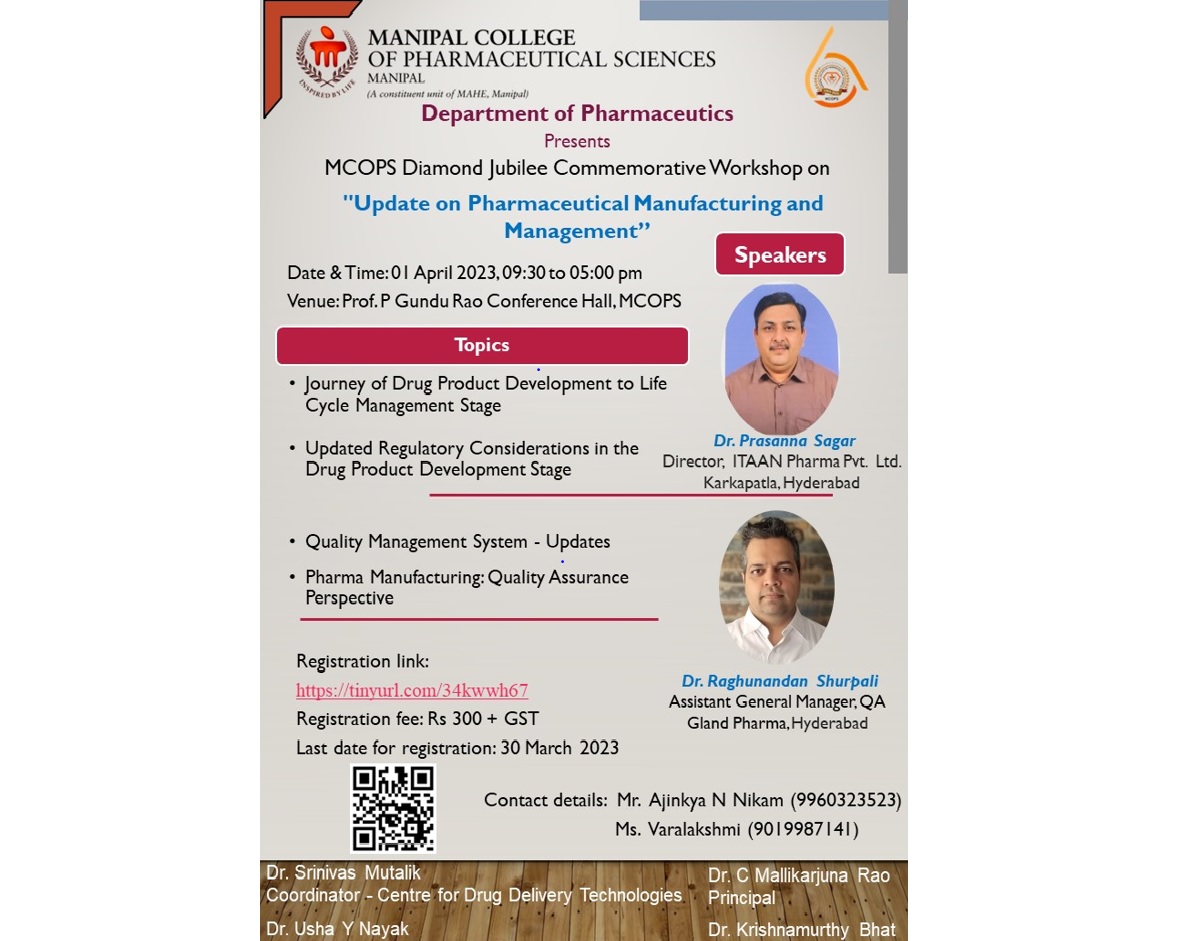 Department of Pharmaceutics Presents MCOPS Diamond Jubilee Commemorative workshop on "Update on Pharmaceutical Manufacturing and Management"