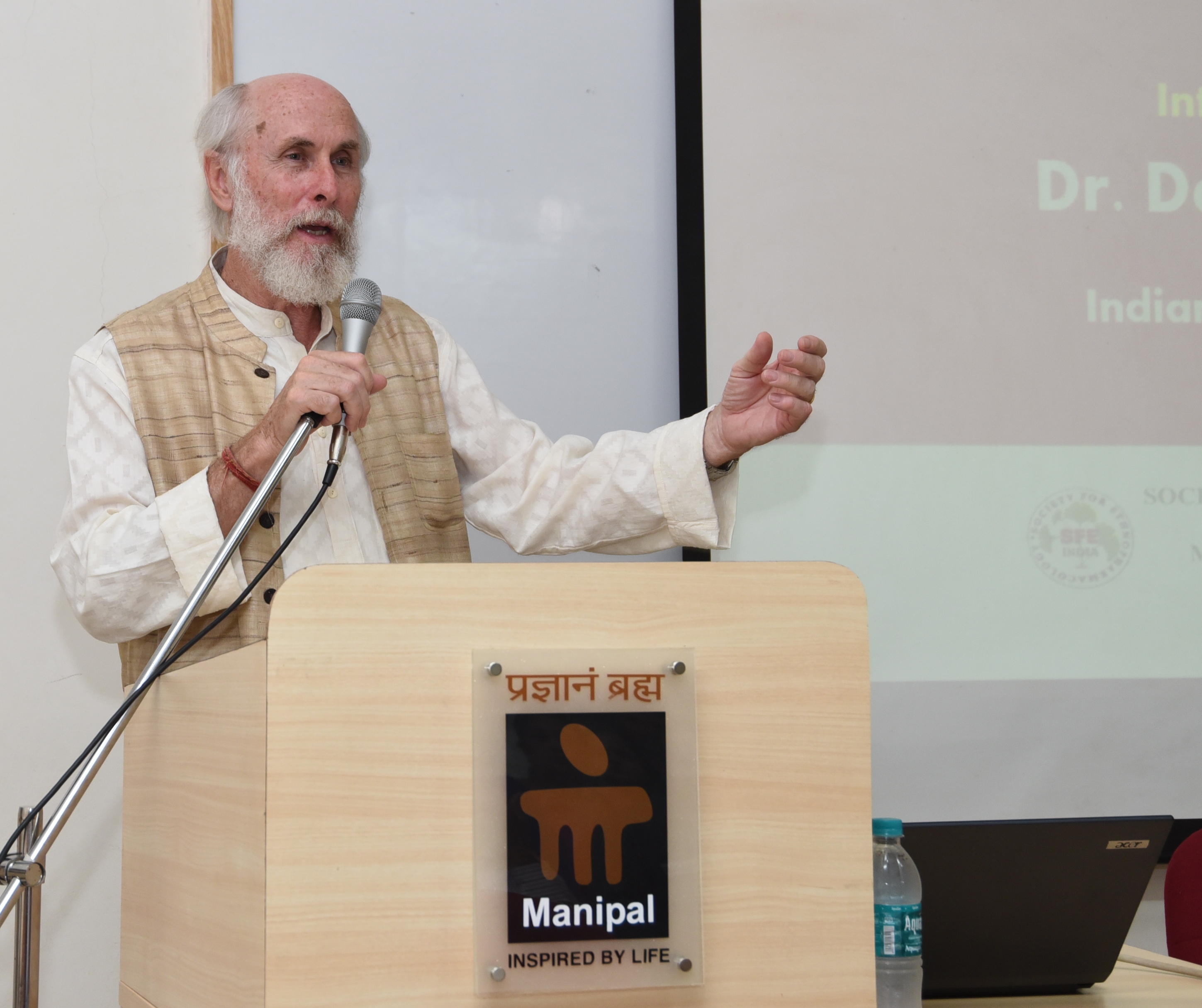 Dr David Frawley, an eminent researcher and scholar of Indian history and yogic practices delivered an impressive lecture on vedic knowledge and yoga practices at MCOPS on 17 February 2016. Center for Integrative Medicine and Research (Manipal Academy of Higher Education) and Society for Ethnopharmacology (SFE) Manipal Chapter jointly organized the lecture. Dr Frawley opined that yoga is a part of Ayurvedic practice and is meant to build a healthy body with a healthy mind. He advocated the knowledge of Vedas for both yoga and Ayurvedic practitioners. His affirmation that ‘yoga is not a treatment for illnesses but an aid to promote healthy thought processes and consciousness among patients’ was well received by the large gathering that had assembled at Dr. P Gundu Rao Lecture Hall. Dr. N Udupa, Convener of SFE, Manipal Chapter and Director of Research, Manipal Academy of Higher Education, welcomed the gathering and introduced the guest speaker. Dr. M Sreenivasa Reddy, vice principal MCOPS proposed the vote of thanks. Dr. Saleemulla Khan (Assistant Professor, Pharmacognosy and Secretary, SFE) conducted the proceedings.