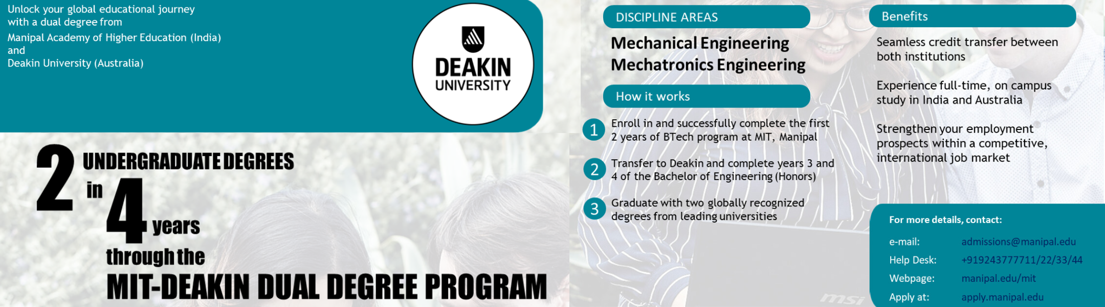 The School offers a dual degree program that allows students to complete two undergraduate degrees in four years. Students begin by enrolling in and successfully completing the first two years of the Bachelor of Technology (BTech) program in the Mechanical or Mechatronics stream at the Manipal Institute of Technology (MIT). Following this, they transfer to Deakin University to complete the remaining two years of the Bachelor of Engineering (Honours) program. Upon successful completion of the program, students graduate with two globally recognized degrees from two leading universities, MIT and Deakin University, enhancing their academic credentials and career prospects. (Brochure)