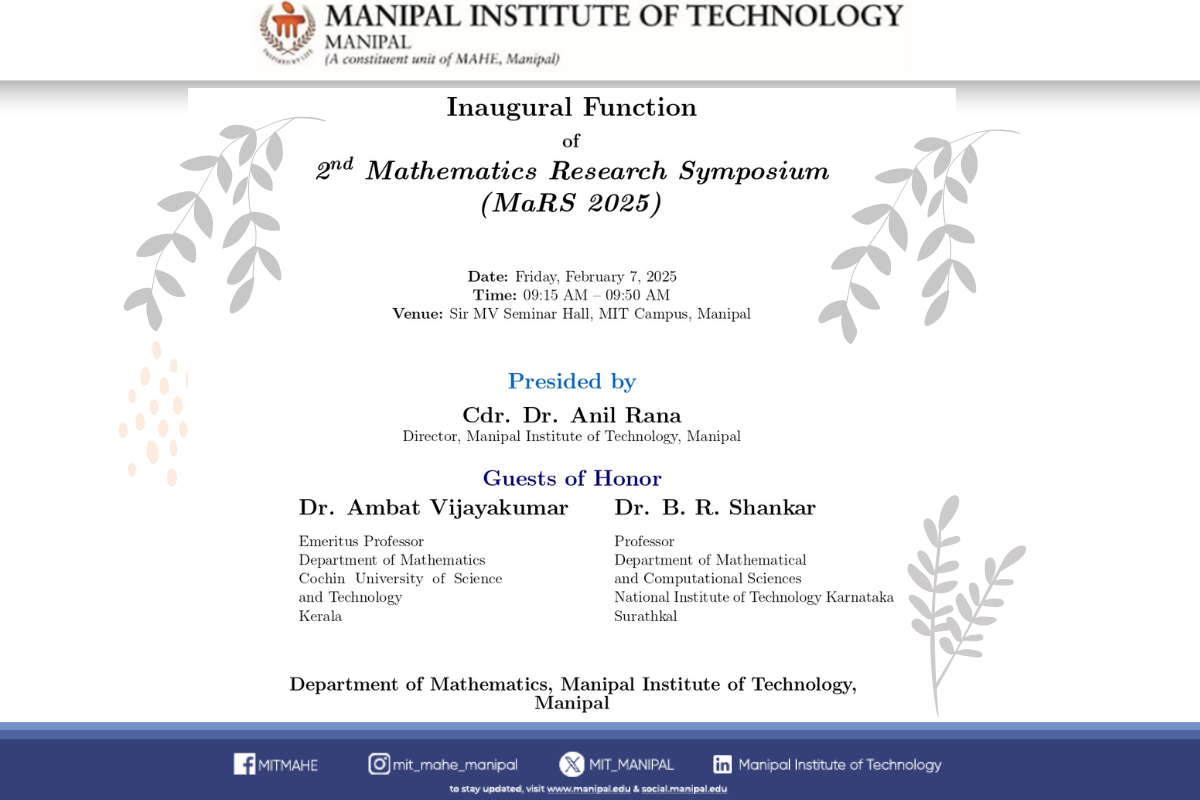 The Department of Mathematics, MIT Manipal, to organizing the 2nd Mathematics Research Symposium (MaRS 2025) on 7th–8th February 2025 at MV Seminar Hall. The event will be presided over by Cdr Dr. Anil Rana, Director, MIT, with esteemed guests of honor Dr. Ambat Vijayakumar, Emeritus Professor, Department of Mathematics, Cochin University of Science and Technology, and Dr. B. R. Shankar, Professor, Department of Mathematics and Computer Science, NIT Surathkal.