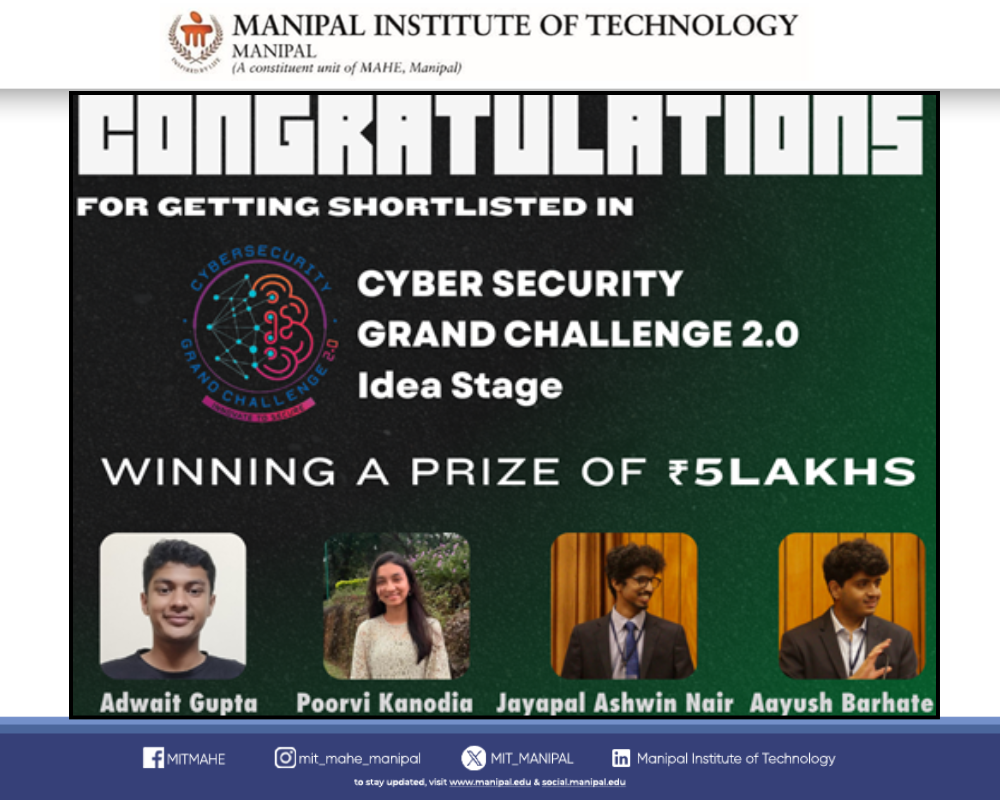 We are delighted to announce that Team Cryptonite — Adwait Gupta, Poorvi Kanodia, Jayapal Ashwin Nair, and Aayush Barhate — from MIT Manipal has been shortlisted in the Cyber Security Grand Challenge 2.0 (Idea Stage) and awarded a ₹5 lakh prize. Conducted by DSCI under the Ministry of Electronics & Information Technology, Government of India, this prestigious nationwide competition promotes innovation and excellence in cybersecurity.
