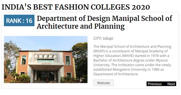 Fashion Design  (Department of Design, Manipal School of Architecture & Planning)  has ranked 16th in INDIA TODAY- MDRA best colleges ranking, 2020.