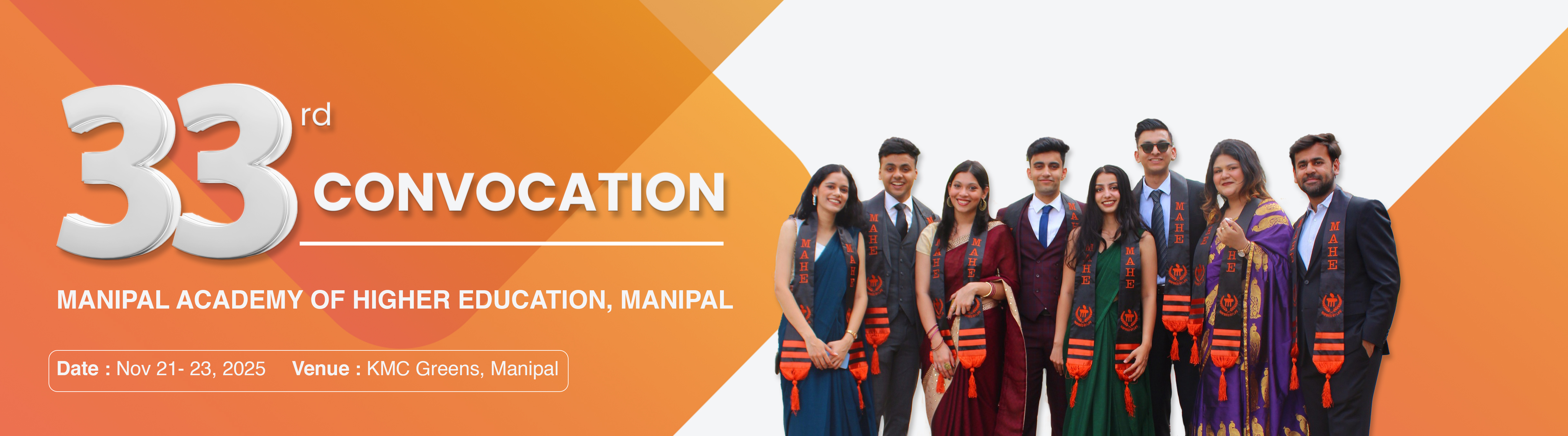 We are pleased to announce that the 33rd Convocation of Manipal Academy of Higher Education (MAHE), Manipal, will be held from November 21 to 23, 2025, at KMC Greens, Manipal. On this occasion, we will honour the achievements of our graduating students as they embark on their future careers and personal endeavours.