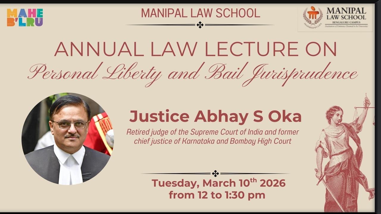 "Manipal Law School, Bengaluru, is pleased to host its Annual Law Lecture on the theme “Personal Liberty and Bail Jurisprudence.” The lecture will be delivered by Justice Abhay S. Oka, former Judge of the Supreme Court of India and former Chief Justice of the Karnataka High Court.