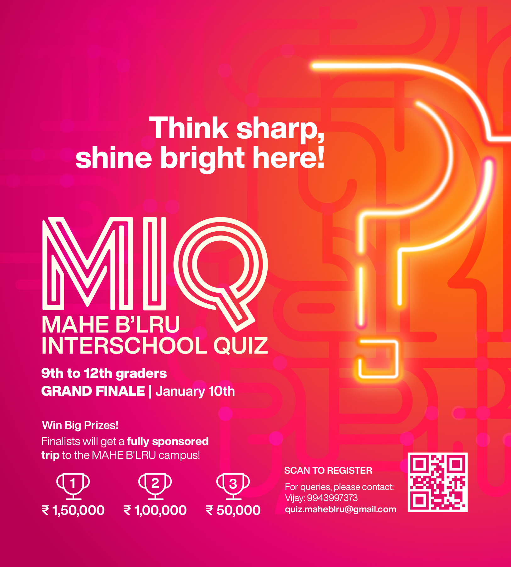 The MAHE Bengaluru Interschool Quiz (MIQ) 2025! Open to sharp young minds of classes 9th TO 12th from over 3000 schools, this event is a celebration of knowledge and brilliance.