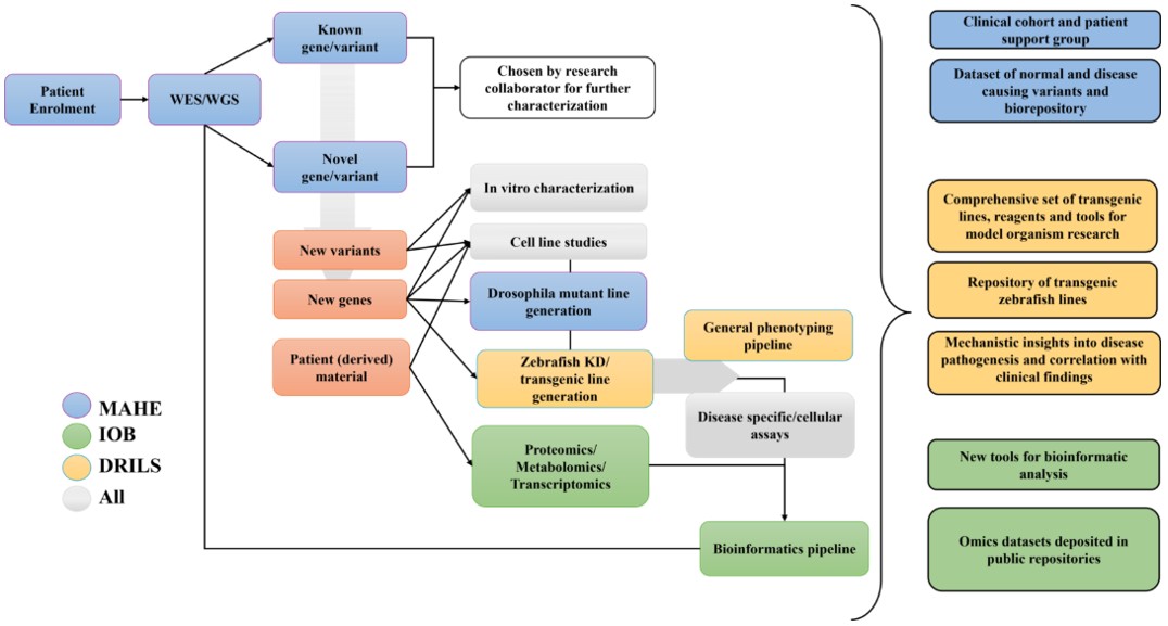 Our interdisciplinary team comprises clinicians with expertise in medical genetics, scientists experienced in cellular and molecular biology and multi-omics technologies, and computational biologists specializing in genomic data analysis. The Centre establishes and sustains well-characterized patient cohorts and a biorepository, employing next-generation sequencing to identify genomic alterations associated with rare diseases. Functional validation of identified variants is carried out using cellular and animal models, coupled with transcriptomic, proteomic, and metabolomic analyses to elucidate disease mechanisms.