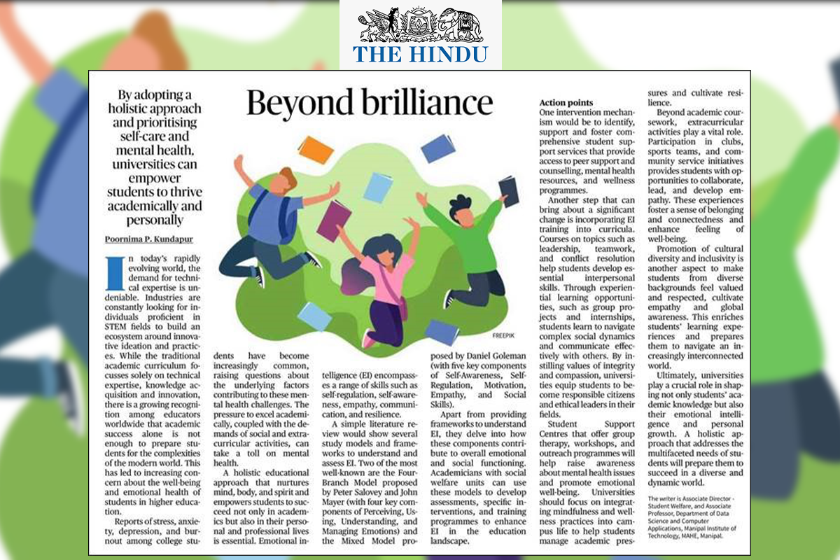 Manipal, 04 May 2024: The author's article, How universities can nurture students’ emotional intelligence and personal growth, by Dr Poornima P. Kundapur, Associate Director - Student Welfare, and Associate Professor, Department of Data Science and Computer Applications, Manipal Institute of Technology (MIT), Manipal.