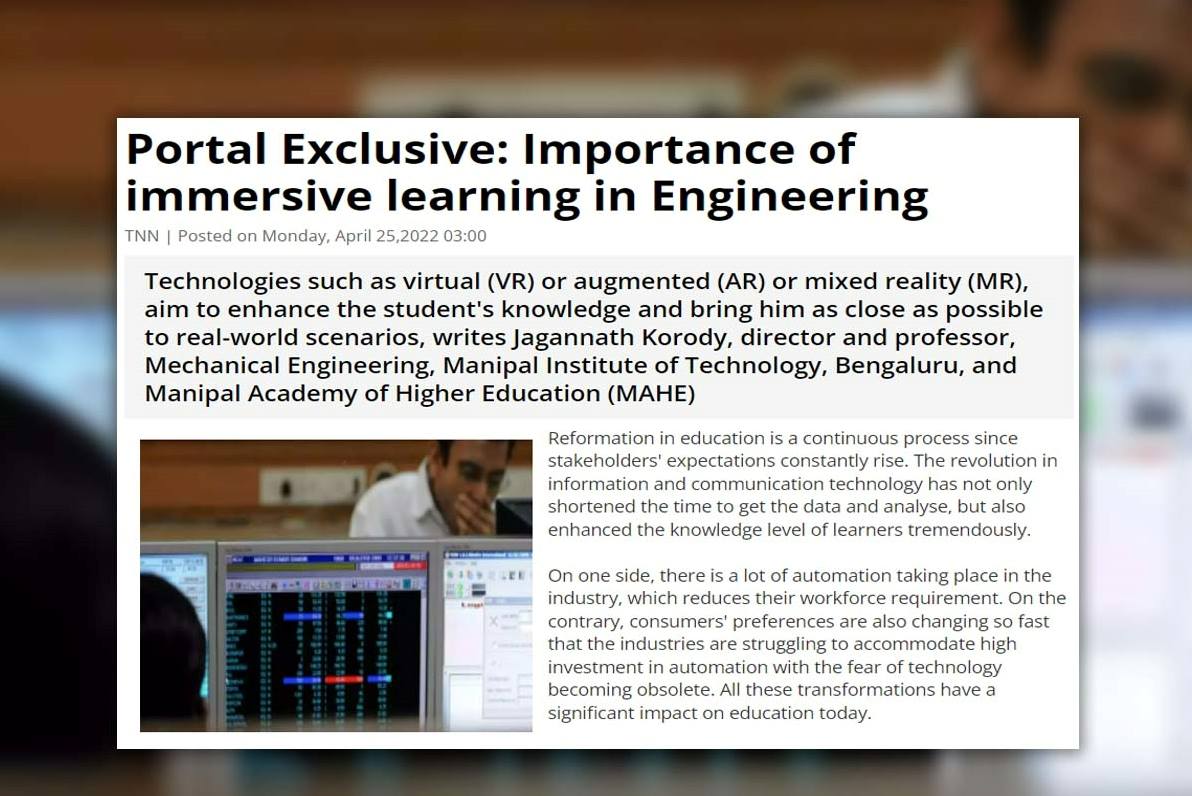 Manipal, 25th April 2022: The author’s article, “Importance of immersive learning in Engineering” by Prof. Jagannath Korody, Director and Professor, Mechanical Engineering, Manipal Institute of Technology (MIT), MAHE-Bengaluru.