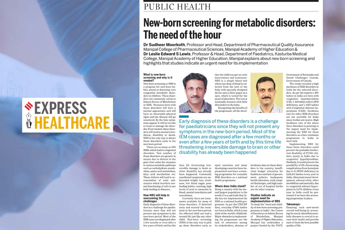 Manipal, 25th July 2022: The author’s article, Newborn screening for metabolic disorders: The need of the hour, by Dr Sudheer Moorkoth, Professor and Head, Department of Pharmaceutical Quality Assurance MCOPS Manipal, and Dr Leslie Edward S Lewis, Professor & Head, Department of Paediatrics, KMC Manipal.