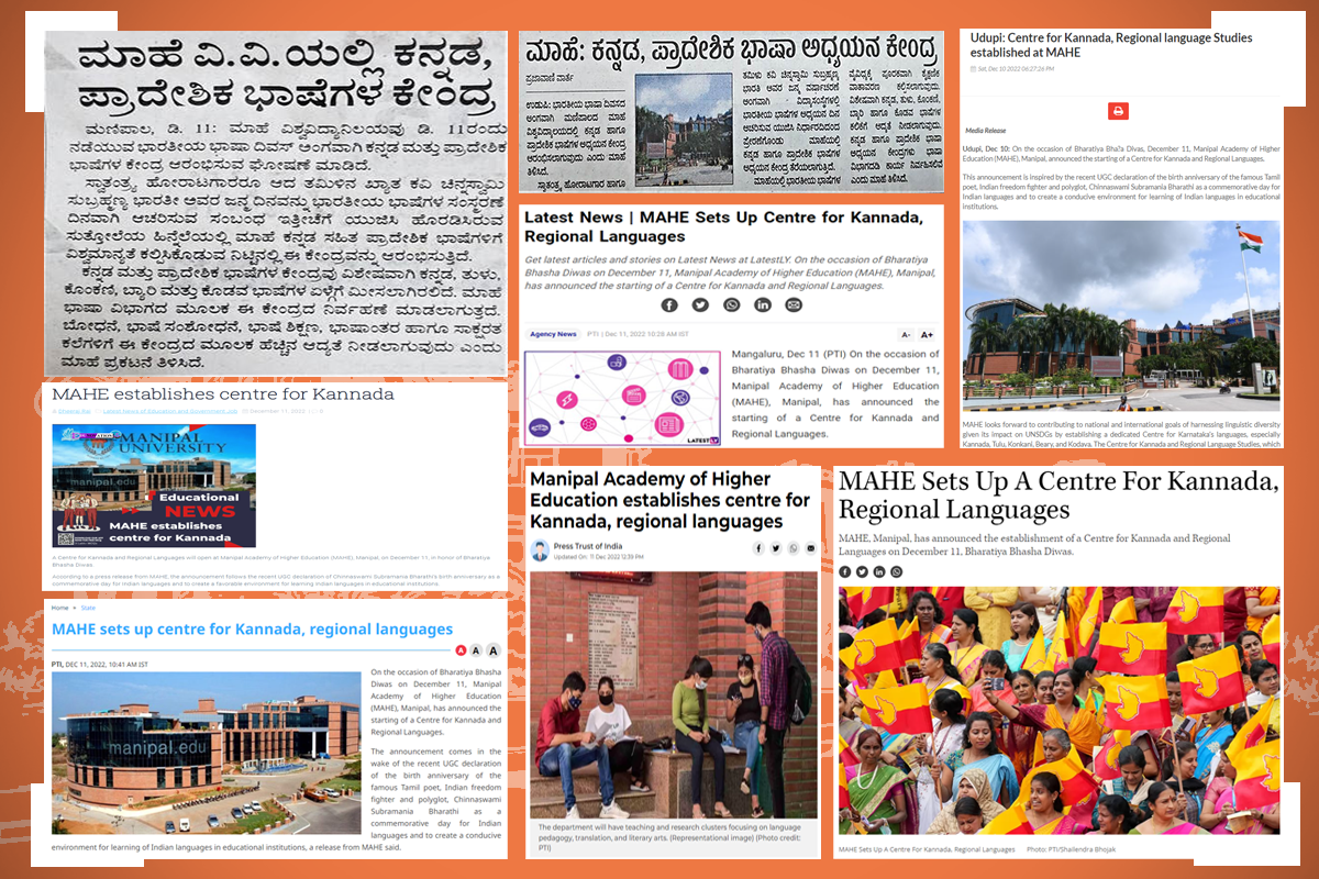 Manipal, 10th December 2022: On the occasion of Bhāratiya Bhāṣa Divas, December 11th, Manipal Academy of Higher Education (MAHE), Manipal, announced the starting of a Centre for Kannada and Regional Languages. This announcement is inspired by the recent UGC declaration of the birth anniversary of the famous Tamil poet, Indian freedom fighter and polyglot, Chinnaswami Subramania Bharathi as a commemorative day for Indian languages and to create a conducive environment for learning of Indian languages in educational institutions. MAHE looks forward to contributing to national and international goals of harnessing linguistic diversity given its impact on UNSDGs by establishing a dedicated Centre for Karnataka’s languages, especially Kannada, Tulu, Konkani, Beary, and Kodava. The Centre for Kannada and Regional Language Studies, which will be housed in the Department of Languages (DoL) at MAHE, will have teaching and research clusters focusing on language pedagogy, translation, and literary arts.