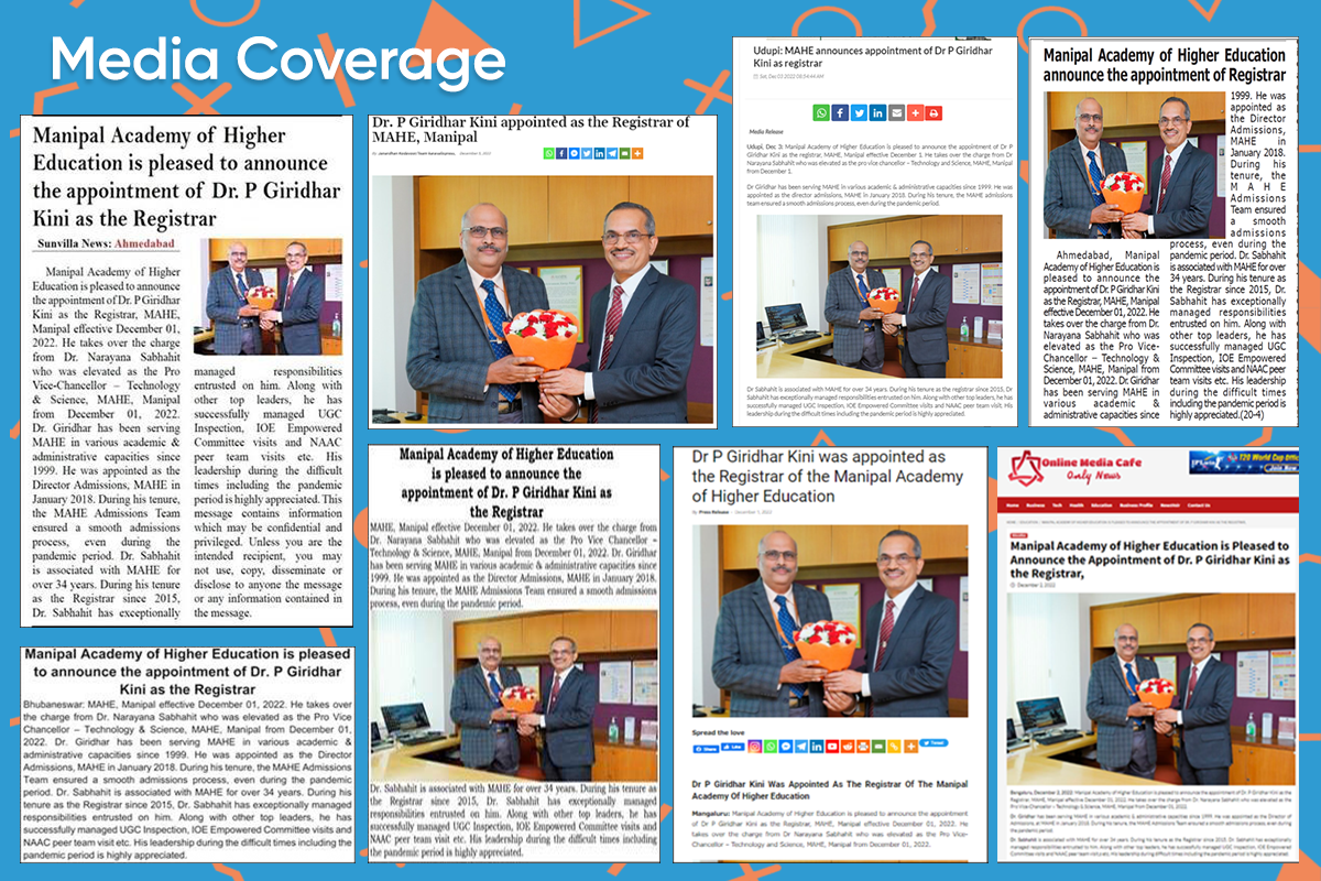 Manipal, 01st December 2022: Dr. P Giridhar Kini has been appointed as Registrar of MAHE, Manipal. He takes over the charge from Dr. Narayana Sabhahit, elevated as the Pro Vice Chancellor – Technology & Science, MAHE, Manipal.