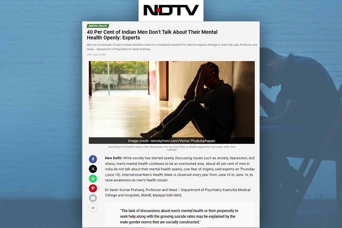 Manipal June 13, 2024: - In the article, 40 Per Cent of Indian Men Don’t Talk About Their Mental Health Openly: Experts, valuable insights are given by Dr Samir Kumar Praharaj, Professor and Head – Department of Psychiatry, Kasturba Medical College (KMC), Manipal.