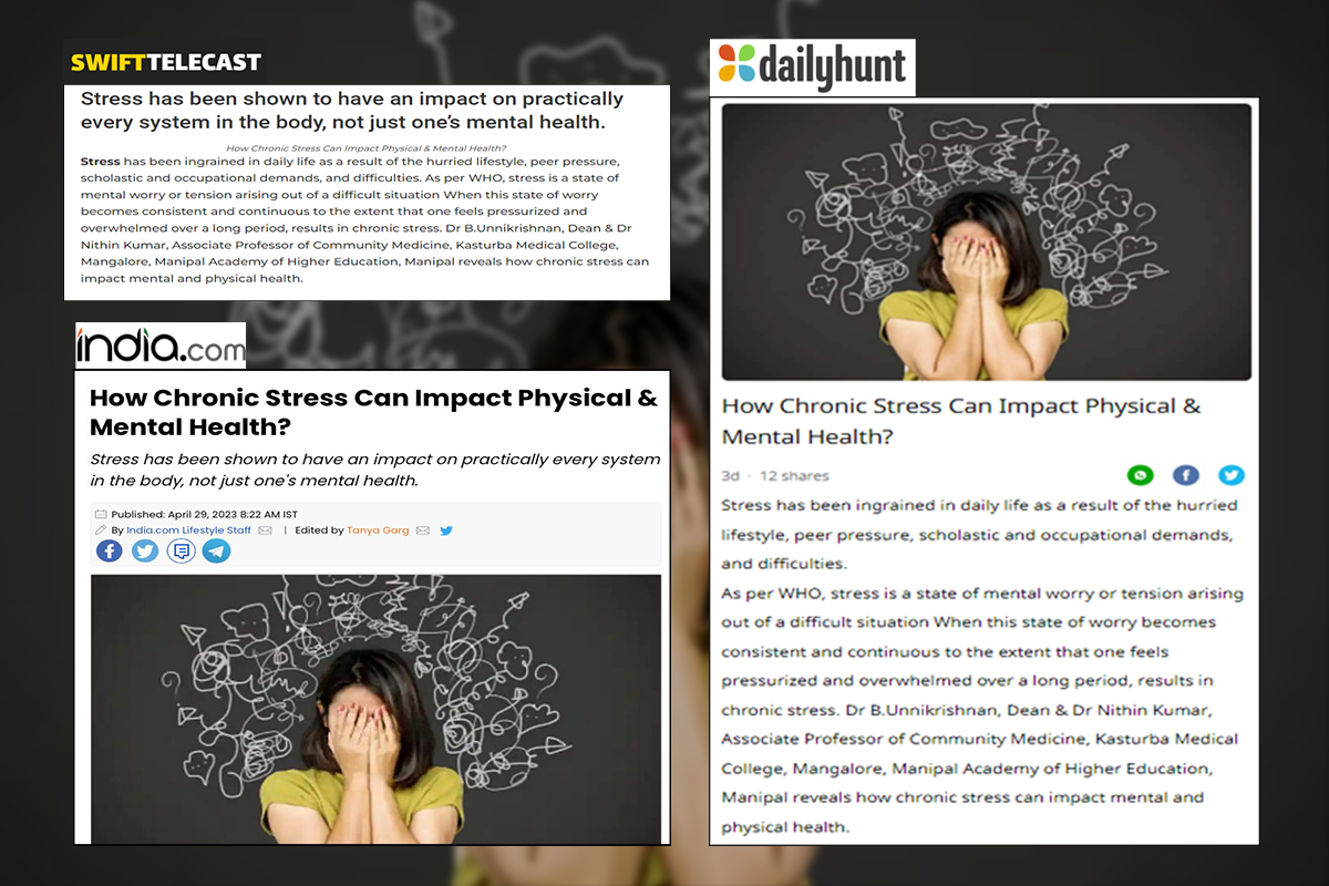 Manipal, 29th April 2023: The author's article, "How Chronic Stress Can Impact Physical and Mental Health” by Dr B. Unnikrishnan, Dean & Dr Nithin Kumar, Associate Professor of Community Medicine, Kasturba Medical College (KMC), Mangalore.
