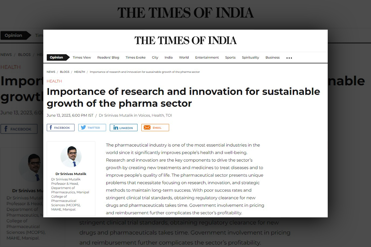 Manipal, 13 June 2023: The author’s article, “Importance of Research and Innovation for sustainable growth of the Pharma Sector”, by Dr Srinivas Mutalik, Professor & Head, Department of Pharmaceutics, Manipal College of Pharmaceutical Sciences (MCOPS), Manipal.