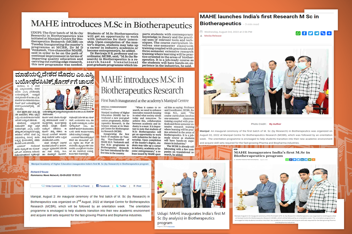 Inaugurating the master’s program at MCBR, Lt General (Dr) M.D. Venkatesh, Vice Chancellor MAHE said “I am overwhelmed to inaugurate the new program, M. Sc (by Research) in Biotherapeutics, for the first time in India. We extend a warm welcome to our first batch of students who have opted to pursue an M.Sc in Biotherapeutics. I want to assure students and parents that research has always been an area of paramount importance at MAHE. As you may be aware MAHE has secured the prestigious status of “Institution of Eminence”, holds NAAC A++ grading, and holds 7th position in NIRF ranking. In order to retain this spot, we need to be on the path of continual improvement in terms of imparting quality education and carrying out cutting-edge research. When it comes to research, we need to enhance innovative research by keeping in mind what society needs today and tomorrow. To achieve this, a collaboration between Academia and Industry is a must. It is important to note that the students of M Sc Biotherapeutics will get an opportunity to work with industries for their internship. Upon completion of the master’s degree, students may take up a career in industry, or academia or become entrepreneurs.