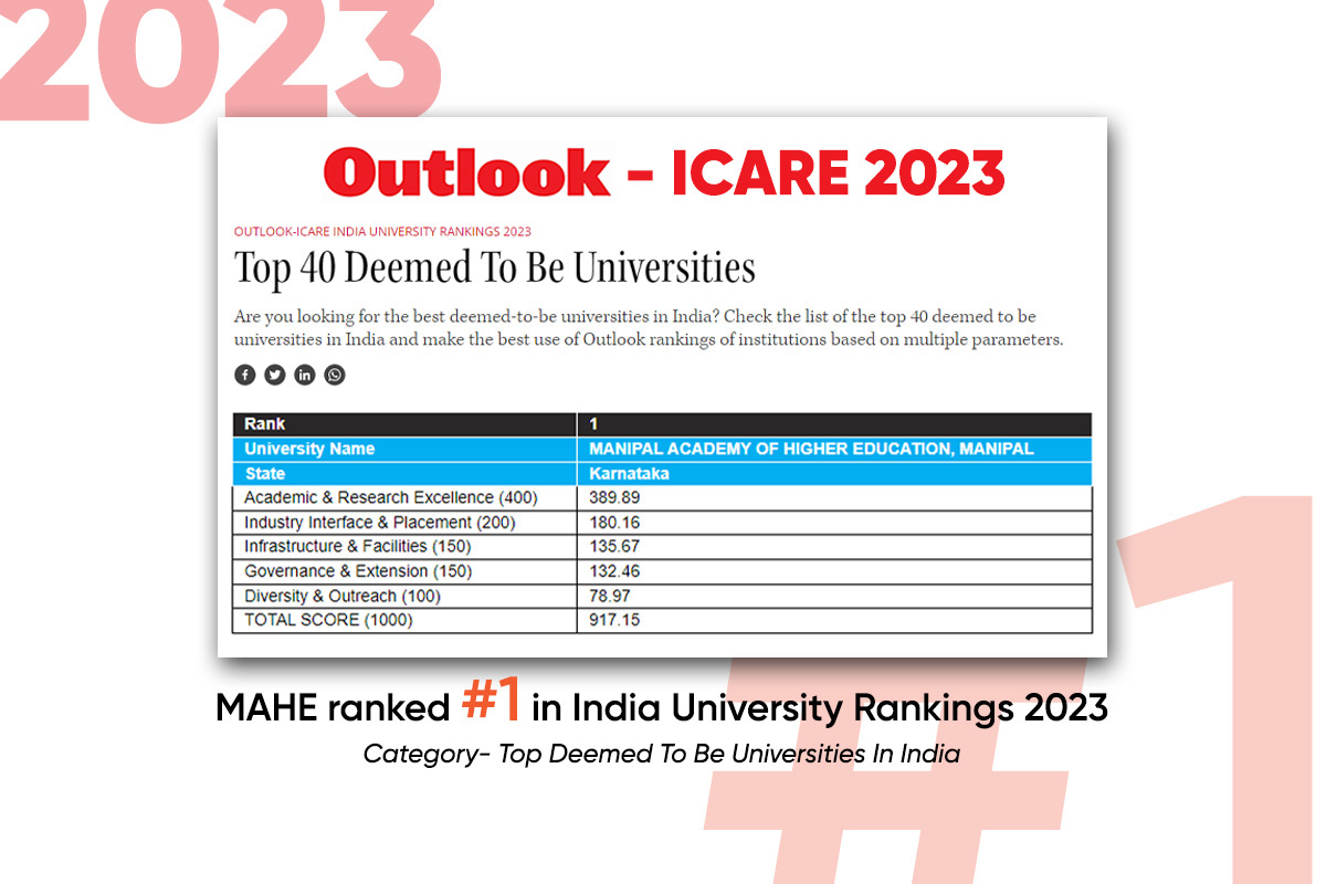 Manipal, 22nd August 2023 – Manipal Academy of Higher Education (MAHE), Manipal, has been crowned the numero uno among the top 40 deemed to be universities in India, according to the prestigious Outlook-ICARE India University Rankings 2023. The university's unwavering commitment to academic excellence, holistic development, and industry engagement has catapulted it to the pinnacle of Indian higher education.