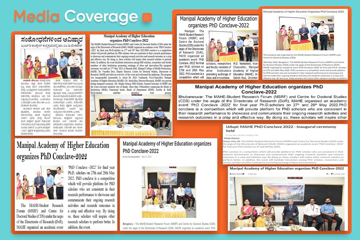 The Manipal Academy of Higher Education (MAHE), Manipal -Student Research Forum (MSRF), and Centre for Doctoral Studies (CDS) under the aegis of the Directorate of Research (DoR), MAHE organized an academic event ‘Ph.D. Conclave -2022’ for final year Ph.D. scholars on 27th and 28th May 2022. Ph.D. Conclave is a competition that will provide a platform for Ph.D. scholars who are consistent in their research performance to showcase and communicate their ongoing research activities and research outcomes in a crisp and effective way. By doing so, these scholars will inspire other research scholars to perform better. In addition, the event will facilitate interaction among Ph.D. scholars, researchers, and faculty members of other Institutions promoting the exchange of ideas and innovations.