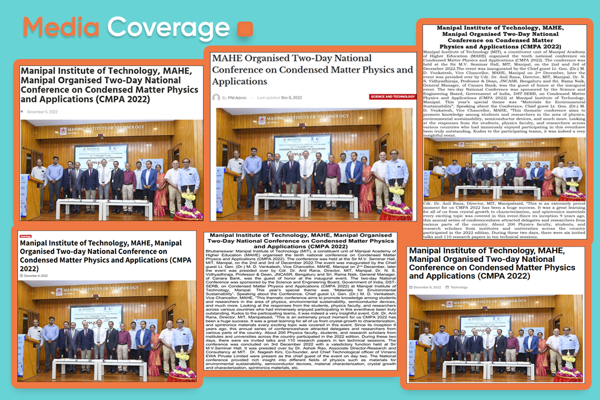 The two-day National Conference was sponsored by the Science and Engineering Board, Government of India, DST-SERB, on Condensed Matter Physics and Applications (CMPA 2022) at Manipal Institute of Technology, Manipal. This year’s special theme was “Materials for Environmental Sustainability”.