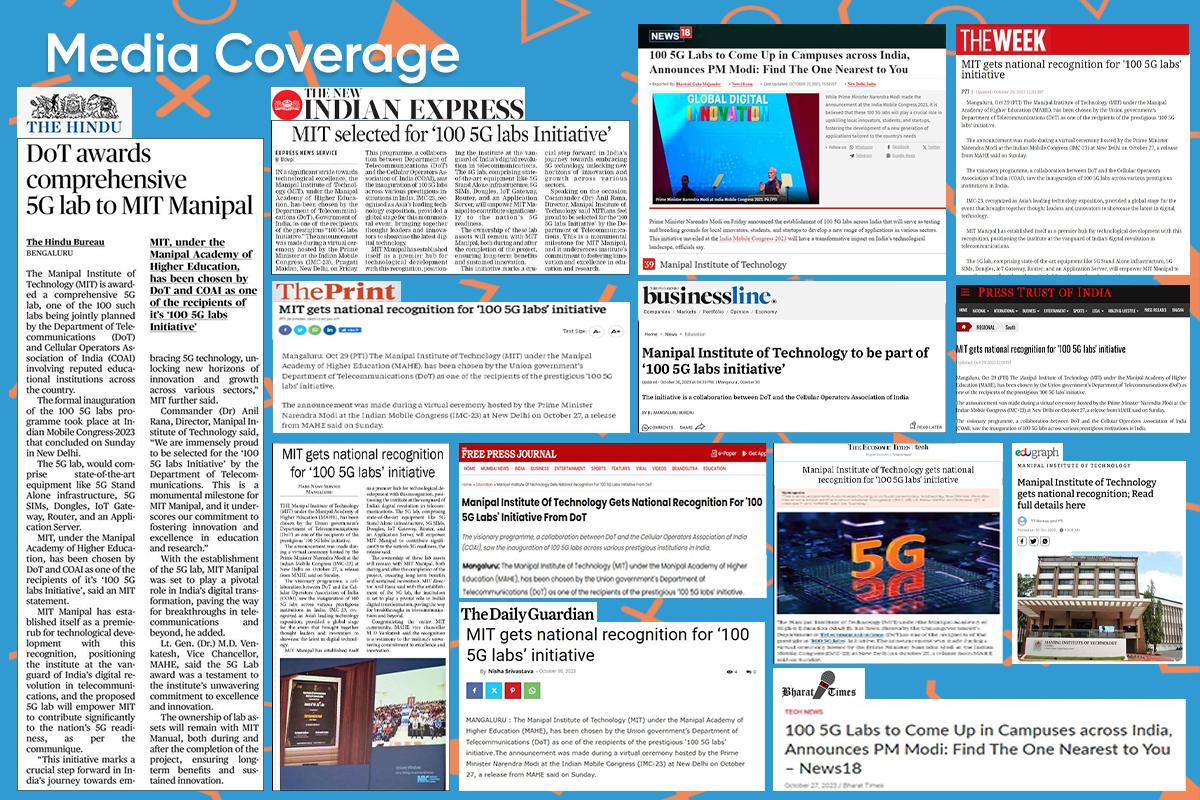 Manipal, 28 October 2023: In a significant stride towards technological excellence, the Manipal Institute of Technology (MIT), under the Manipal Academy of Higher Education, has been chosen by the Department of Telecommunications (DoT), Government of India, as one of the proud recipients of the prestigious "100 5G labs Initiative." The announcement was made during a virtual ceremony hosted by the Honourable Prime Minister Shri Narendra Modi at the Indian Mobile Congress (IMC-23), Pragati Maidan, New Delhi, on October 27, 2023.