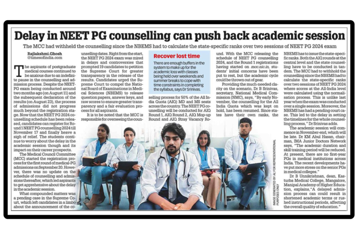 Manipal, 05th November 2024: “Delay in NEET PG counselling can push back academic session”, valuable insights are given by Dr B. Unnikrishnan, Dean & Professor of Community Medicine, Kasturba Medical College (KMC), Mangalore.