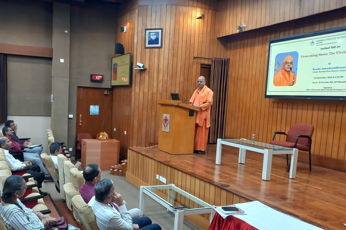 Manipal, 13th September 2024: Swami Atmashriddhananda, Head of the Ramakrishna Mission Ashrama, Kanpur, inspired students, faculty, and staff at the Manipal Institute of Technology (MIT) with his lecture titled “Overcoming Stress – The Vivekananda Way”.