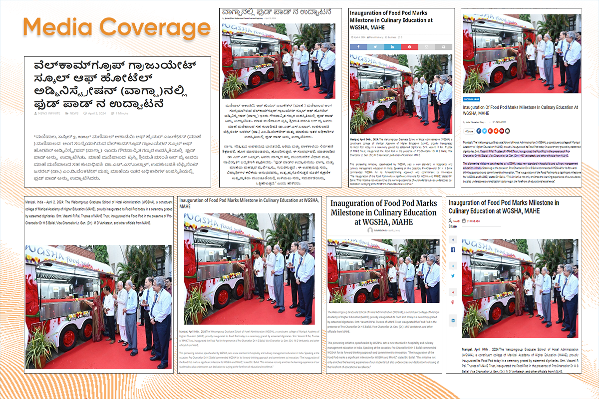 Manipal, April 2, 2024: The Welcomgroup Graduate School of Hotel Administration (WGSHA), a constituent college of Manipal Academy of Higher Education (MAHE), proudly inaugurated its Food Pod today in a ceremony graced by esteemed dignitaries. Smt. Vasanti R Pai, Trustee of MAHE Trust, inaugurated the Food Pod in the presence of Pro Chancellor Dr H S Ballal, Vice Chancellor Lt. Gen. (Dr) M D Venkatesh and other officials from MAHE.