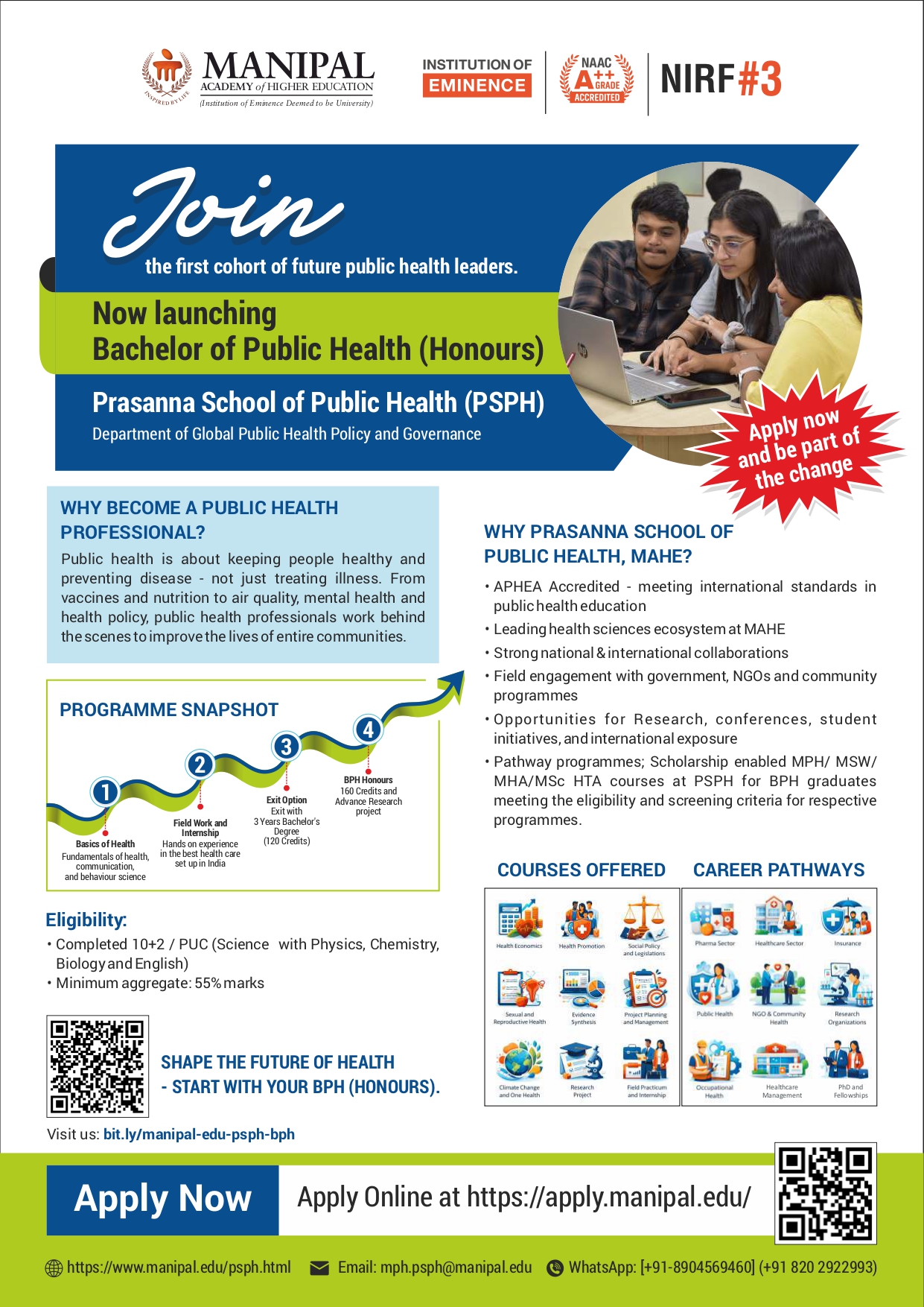 Established in 2009 as the Department of Public Health, PSPH became a proud constituent unit of MAHE in 2017, bringing together specialized departments in Applied Statistics and Data Science, Health Technology and Informatics, Healthcare and Hospital Management, Social and Health Innovation, and Global Public Health Policy and Governance.