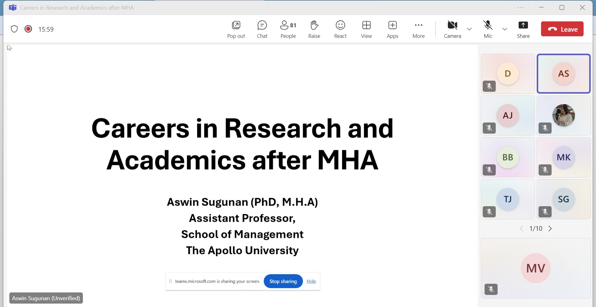 Alumni Cell, Placement Cell & Career Counselling Cell (CCC), Prasanna School of Public Health (PSPH), Manipal Academy of Higher Education (MAHE), Manipal organised an Alumni Interaction Session on “Careers in Research and Academics after MHA” on Saturday, November 23, 2024 (16:00 to 17:00 hours IST) Virtually through Microsoft Teams.