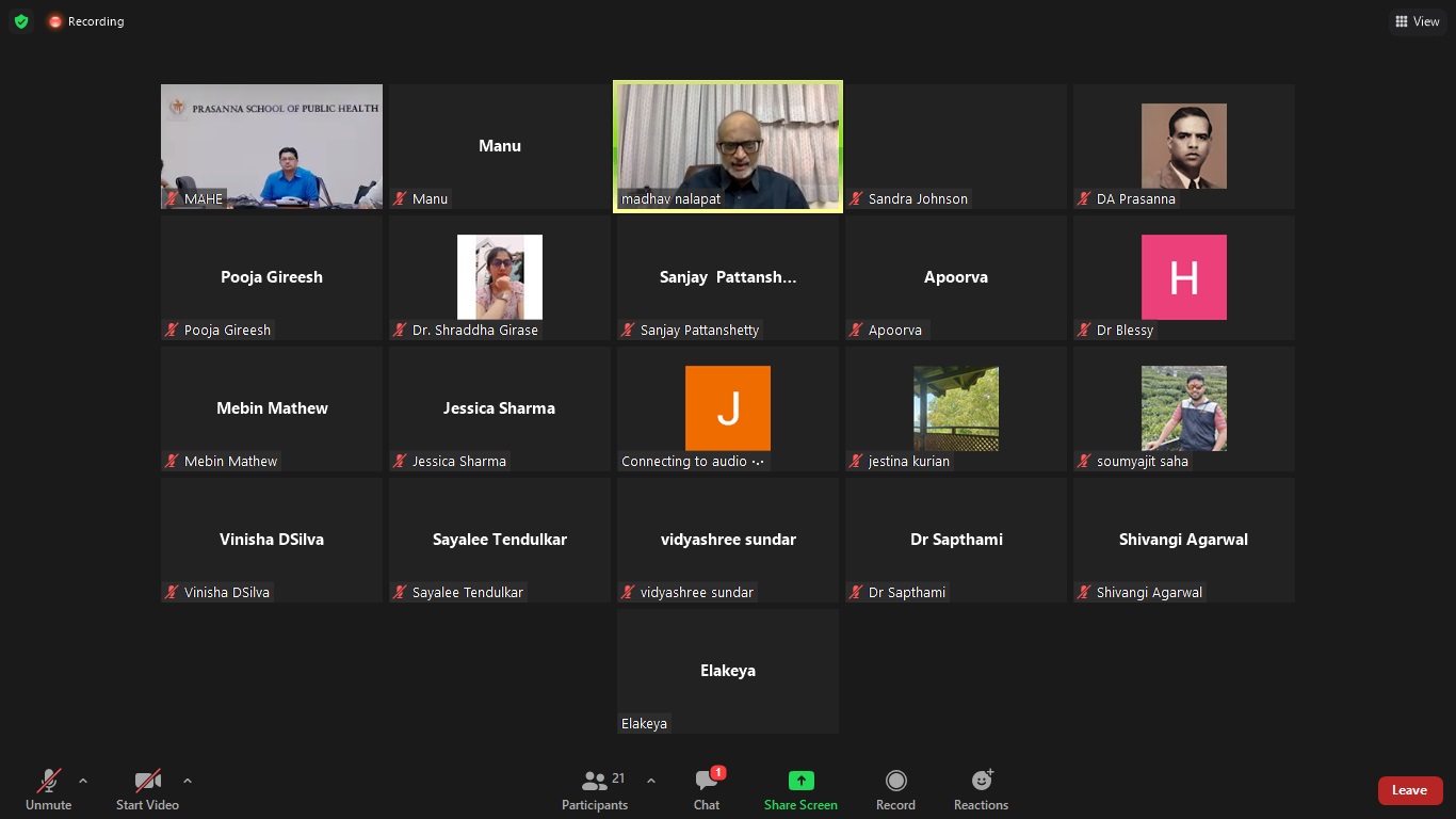 Prof Madhav Das Nalapat (UNESCO) Peace Chair, Department of Geopolitics and International Relations, Manipal Academy of Higher Education, Manipal, spoke about 'Expanding the Concept of Climate Change in a World of Changing Realities' at Prof Rajani Prasanna Endowment Lecture Series on Climate Change and its Impact on Public Health – Lecture III on Wednesday, June 15, 2022, organised by Prasanna School of Public Health. Dr Rajesh Kamath, Faculty, MHA Programme moderated the programme.