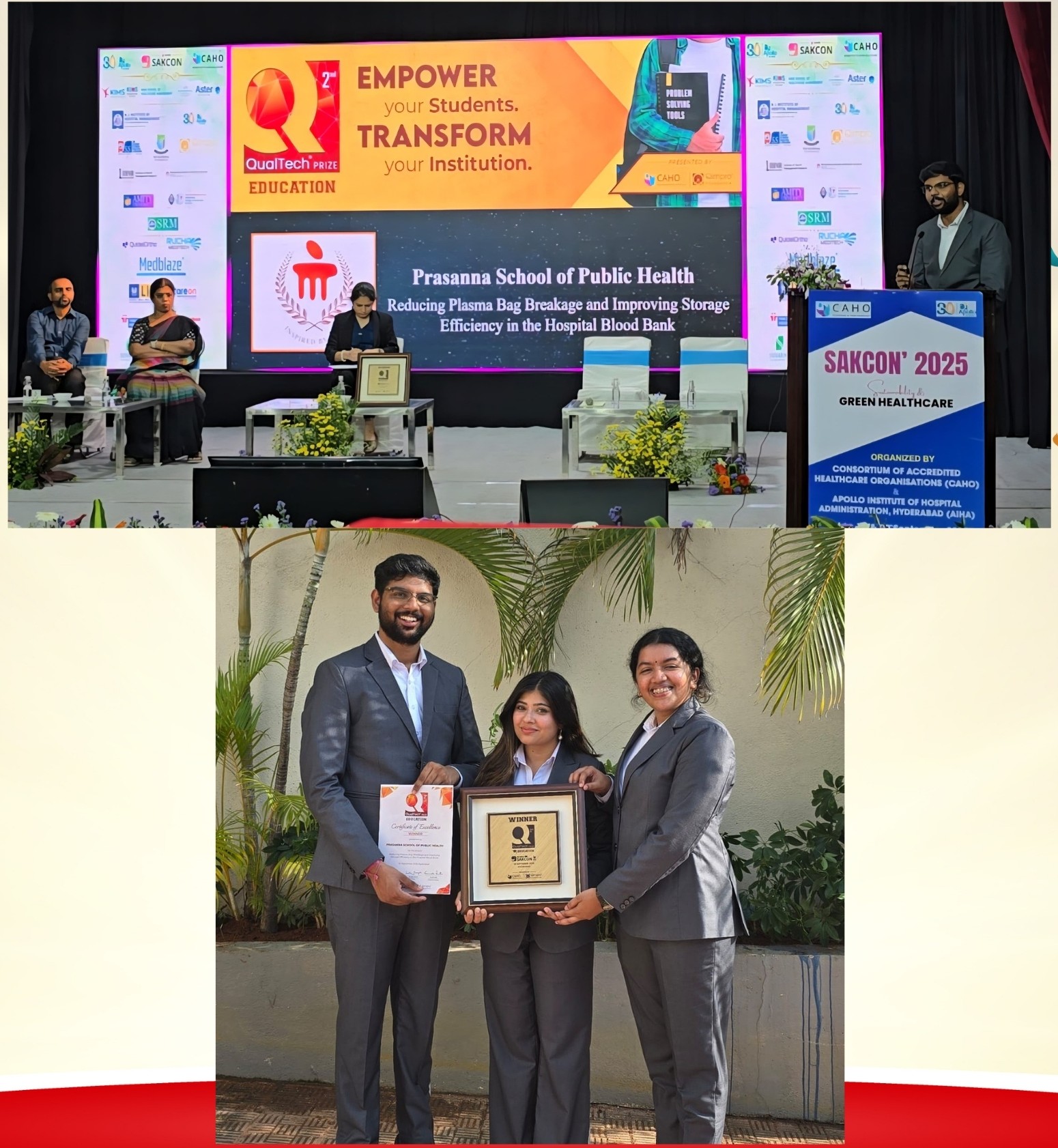 Dipti Ghimire, Jay Bharti, and Pallavi R Kamath, students of the second year MHA Programme, Department of Healthcare and Hospital Management (DHHM) under the Mentorship of Dr Usha Rani, HoD- DHHM, PSPH represented PSPH, MAHE, Manipal. They won the National Level Competition organised by "Qimpro", in collaboration with CAHOSEC – CAHO. They won the "QualTech First Prize – Education and Certificate of Excellence" for the project titled: ‘Reducing Plasma Bag Breakage and Improving Storage Efficiency in the Hospital Blood Bank’ on September 19-20, 2025, in Hyderabad during the 4th Edition of CAHO-SAKCON (Student Annual Knowledge Sharing Conference) at Dr B R Ambedkar Open University, Jubilee Hills, Hyderabad. The event was hosted by Apollo Institute of Hospital Administration in collaboration with CAHO (Consortium of Accredited Healthcare Organisations), based on the Theme 2025: “Sustainability and Green Healthcare” connecting planet health with human health, building healthier healing environments.