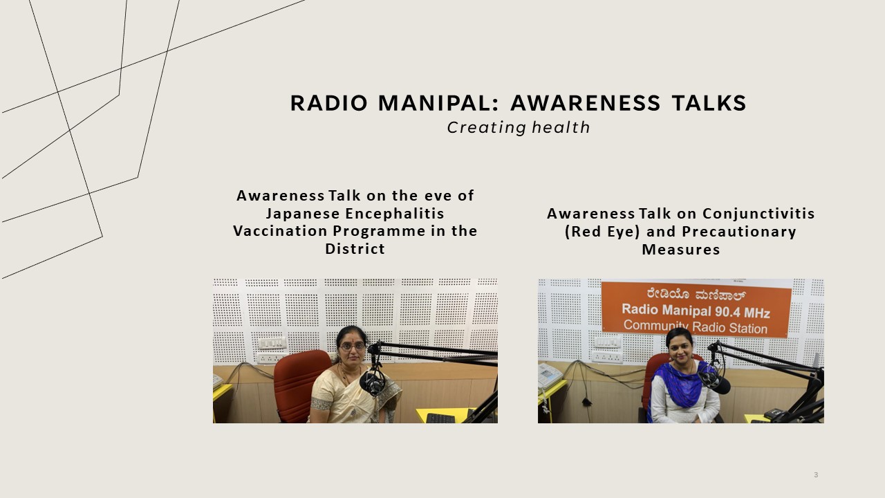 Dr Arathi Rao, Coordinator, MPH Programme, Department of Health Policy, PSPH, MAHE delivered an awareness talk on the eve of “Japanese Encephalitis Vaccination Programme in the District” on December 08, 2022 and Ms Anupama D S (Research Fellow - Qualitative Research Analyst, Department of Global Health Governance delivered an talk on “Conjunctivitis (Red Eye) and Precautionary Measures” on December 16, 2022. Both were Brocasted on Radio Manipal FM 90.4.