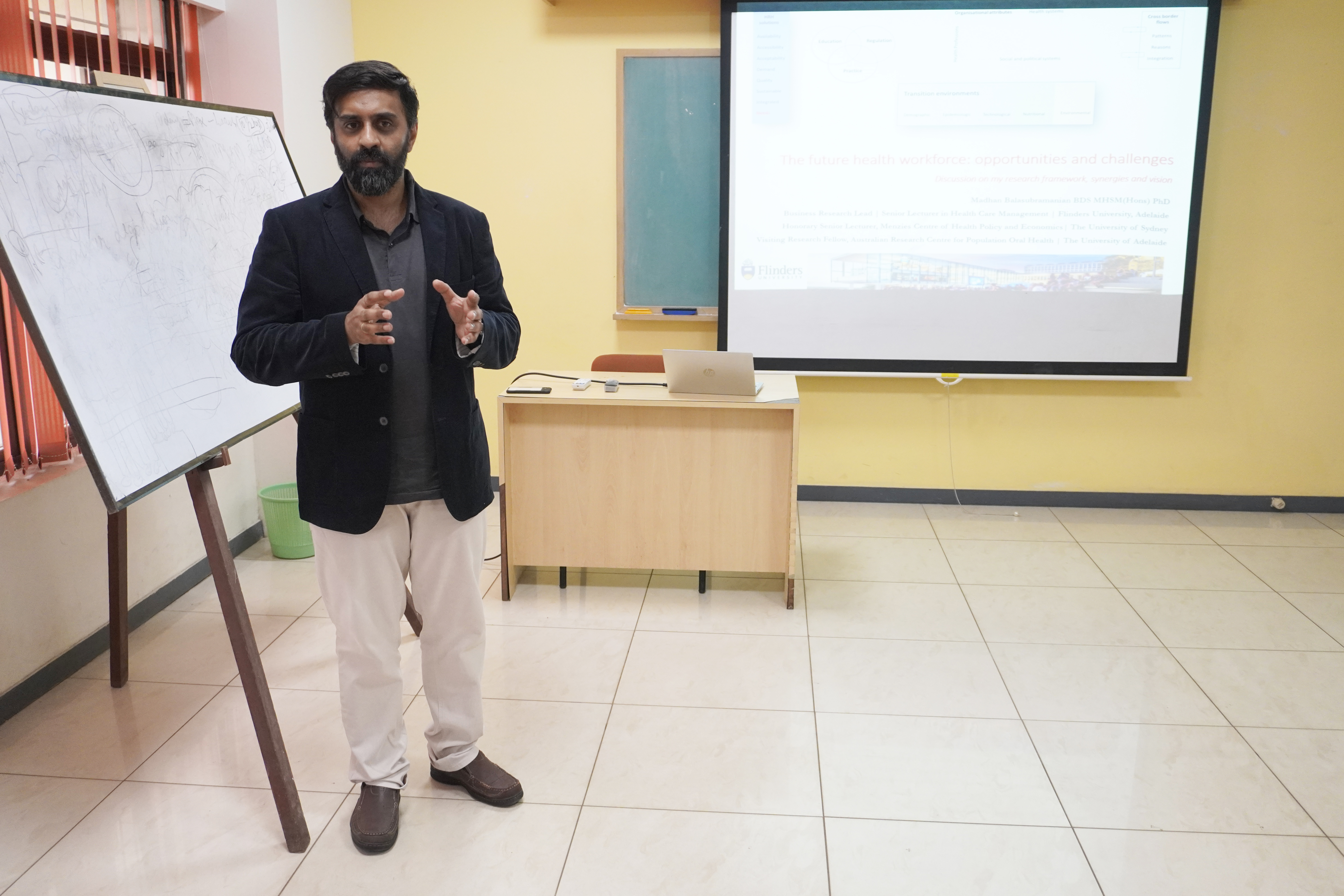 Dr Madhan Balasubramanian, Faculty, Flinders University, Adelaide, Australia delivered a talk on “The Future Health Workforce: Opportunities and Challenges: Research framework, synergies and vision and shared his research experiences, emerging methodologies, and available databases for secondary analysis. Dr Madhan Balasubramanian spoke about education research, healthcare research, indigenous population, migration of people, migration of healthcare professionals, various models for healthcare, various models for education, integrated solutions and models for care.