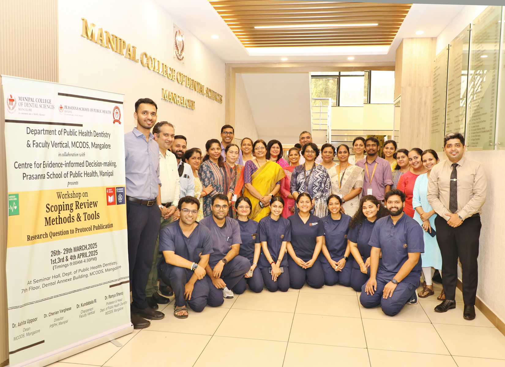 Centre for Evidence-informed Decision-making, Prasanna School of Public Health (PSPH), Manipal Academy of Higher Education (MAHE), Manipal in collaboration with Department of Public Health Dentistry and Faculty Vertical, MCODS (Manipal College of Dental Sciences), MAHE, Mangalore organised a Workshop on Scoping Review Methods and Tools (Research Question to Protocol Publication) from March 26 to 29, 2025 and April 1,3 and 4, 2025 at MCODS, Mangalore.