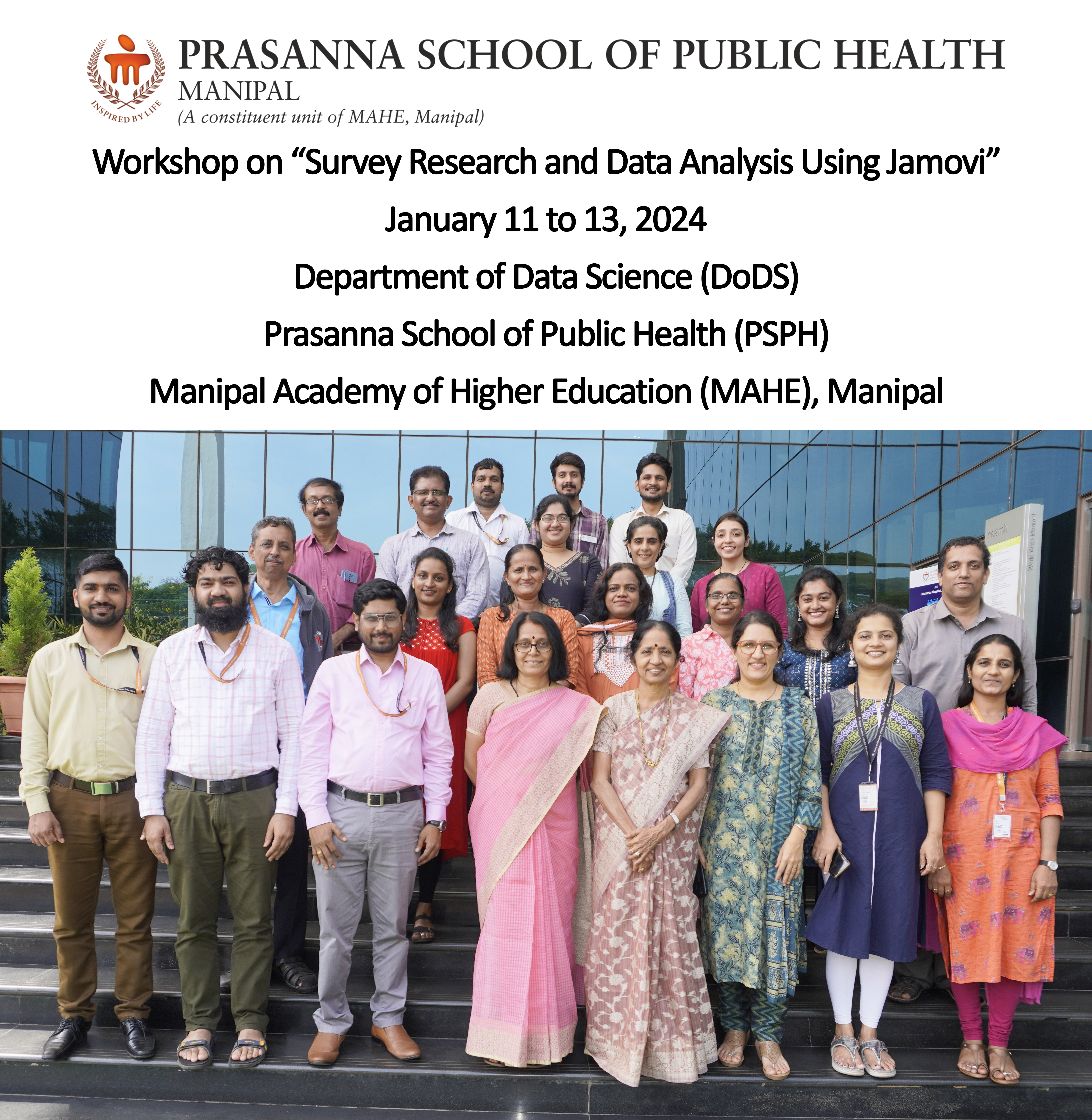 Department of Data Science (DoDS), PSPH, MAHE, Manipal organized the Workshop on “Survey Research and Data Analysis using Jamovi” from January 11 to 13, 2024 through Hybrid Mode - On-Campus on the Premises of R A Fisher Hal. Faculty of the Department of Data Science (DoDS), Prasanna School of Public Health (PSPH), Manipal Academy of Higher Education (MAHE), Manipal were the resource persons during the Workshop.