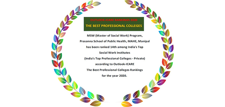 MSW Program at PSPH, MAHE, Manipal has been ranked 14th among India's Top Social Work Institutes (India's Top Professional Colleges - Private) according to Outlook - ICARE The Best Professional Colleges Rankings for the Year 2020: September 7, 2020