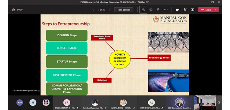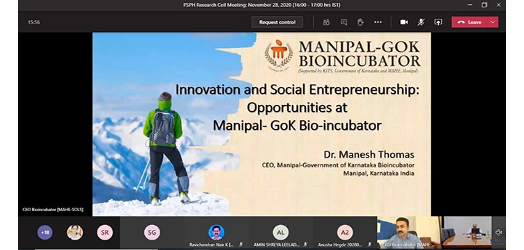 Snapshots from the invited talk on "Innovation and Social Entrepreneurship: Opportunities at Manipal-GoK Bio-incubator" on November 28, 2020 (Saturday), 16:00-17:00 hours IST.
