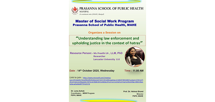 MSW Program, Prasanna School of Public Health, MAHE, Manipal is Organizing a Session on ‘Understanding law enforcement and upholding justice in the context of hatras’ on October 14, 2020. Webinar Link: tiny.cc/o5izsz