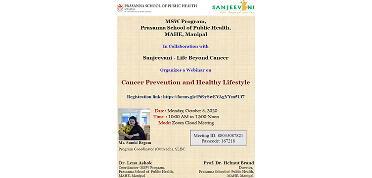 MSW Program, Prasanna School of Public Health, MAHE, Manipal in Collaboration with Sanjeevani - Life Beyond Cancer is Organizing a Webinar on 'Cancer Prevention and Healthy Lifestyle' on Monday, October 5, 2020. Ms. Sumki Begum (Program Coordinator, Outreach, SLBC) will be the resource person for the Webinar.