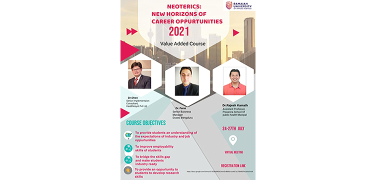 Dr Rajesh Kamath (Faculty, MHA Program, Department of Health Innovation, PSPH) was the resource person for a session on "Basics of Scopus" in the virtual value-added course "Neoterics: New Horizons of Career Opportunities 2021" offered by the Department of Allied Health Sciences, Ramaiah University of Applied Sciences, Bengaluru during July 24-27, 2021.