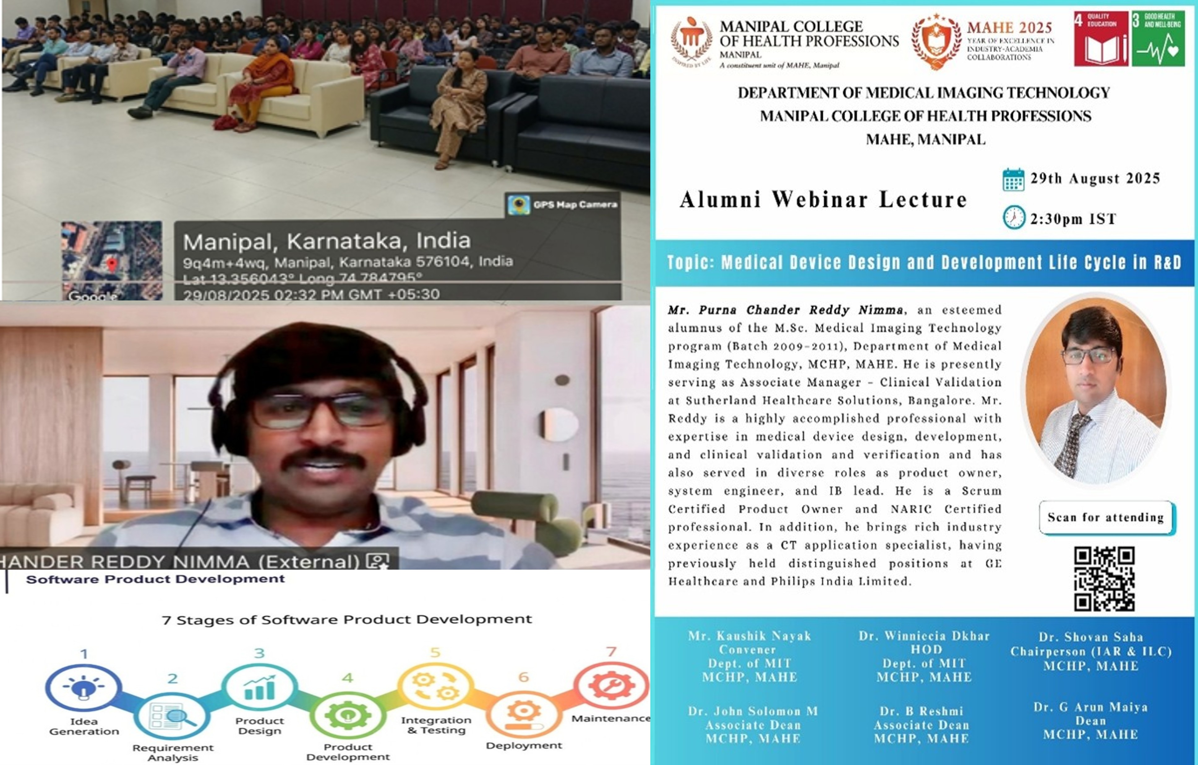 Department of Medical Imaging Technology, Manipal College of Health Professions, MAHE, Manipal organized an Alumni webinar. Mr. Purna Chander Reddy Nimma from Sutherland Healthcare Limited delivered a talk on Medical Device Design and Development Life Cycle in R&D on 29.08.2025, 02.30 p.m., through Microsoft Teams.