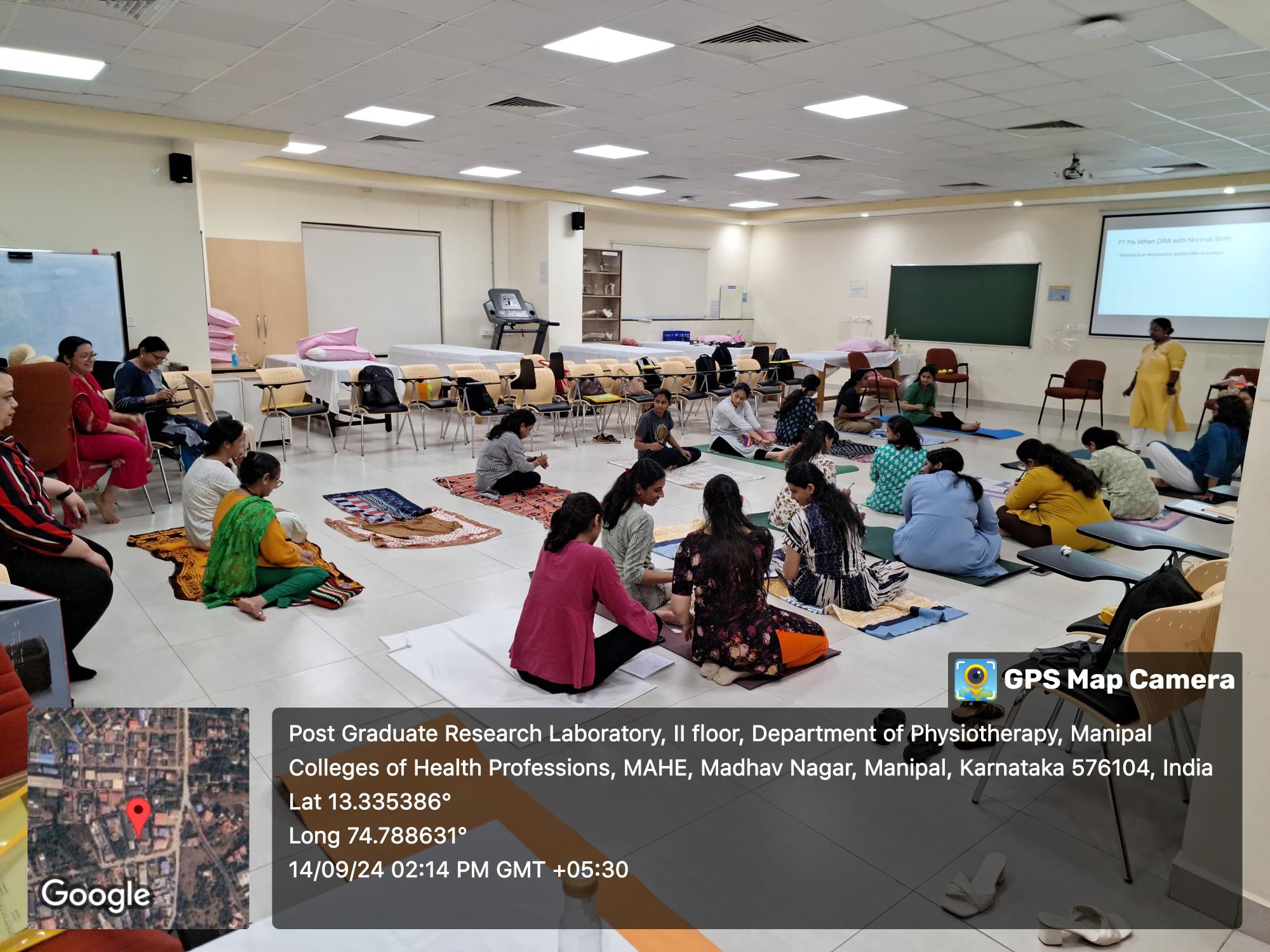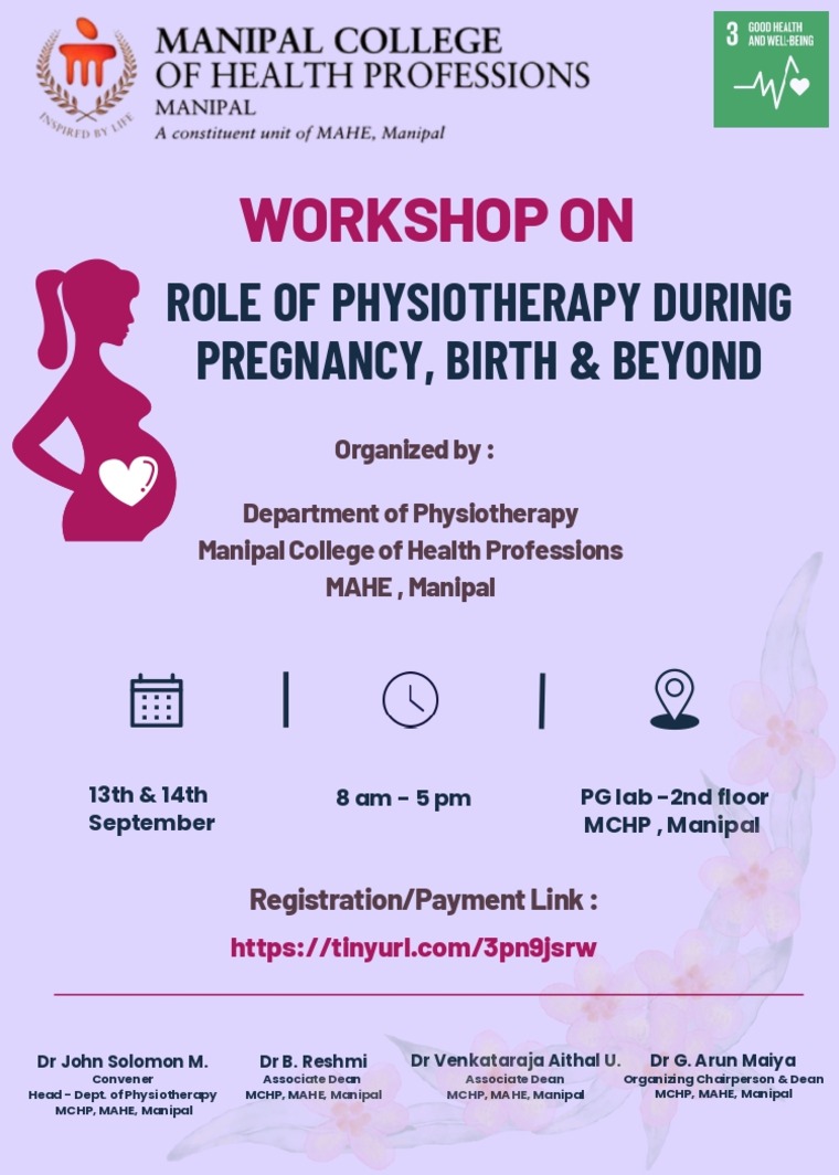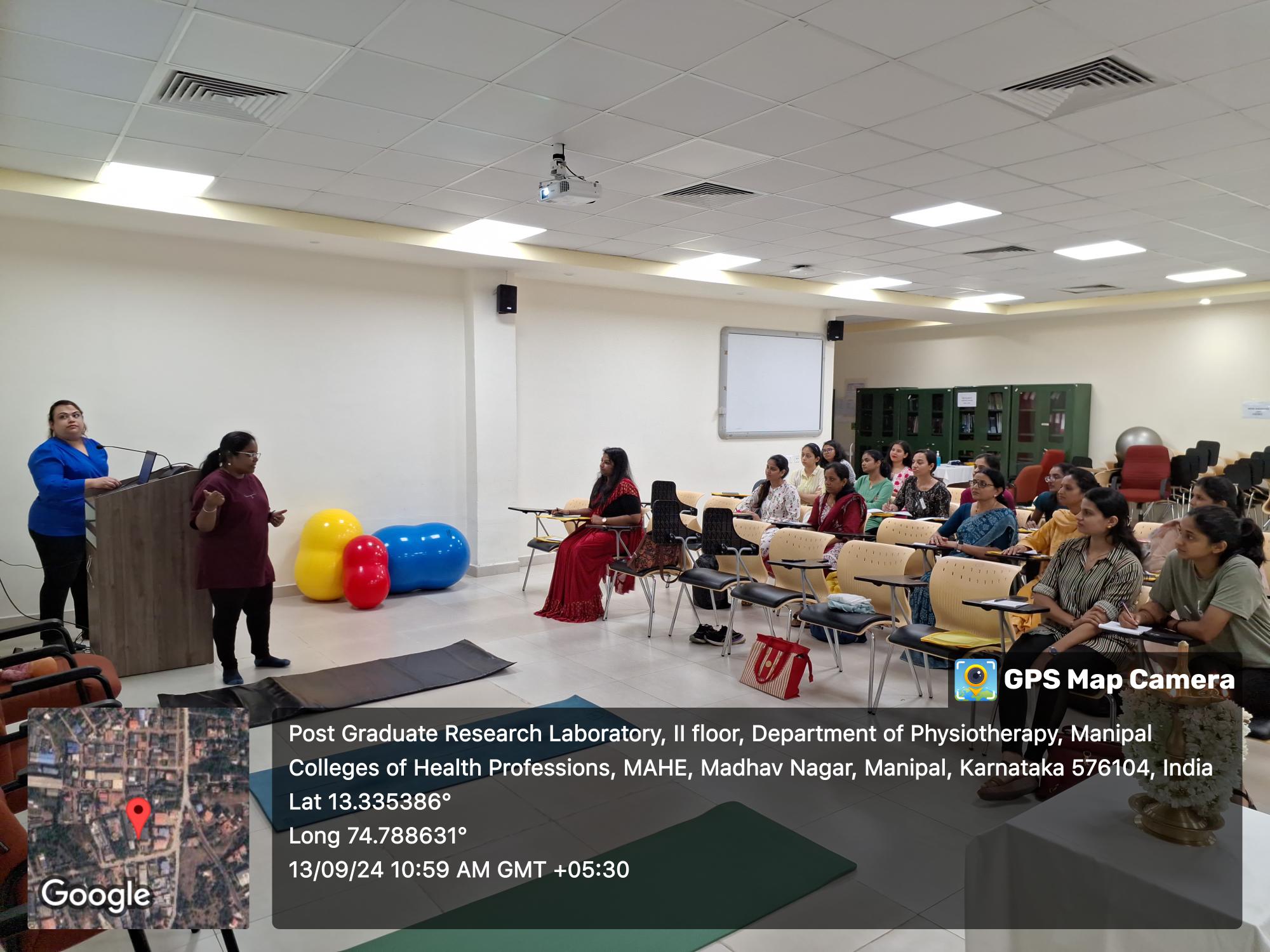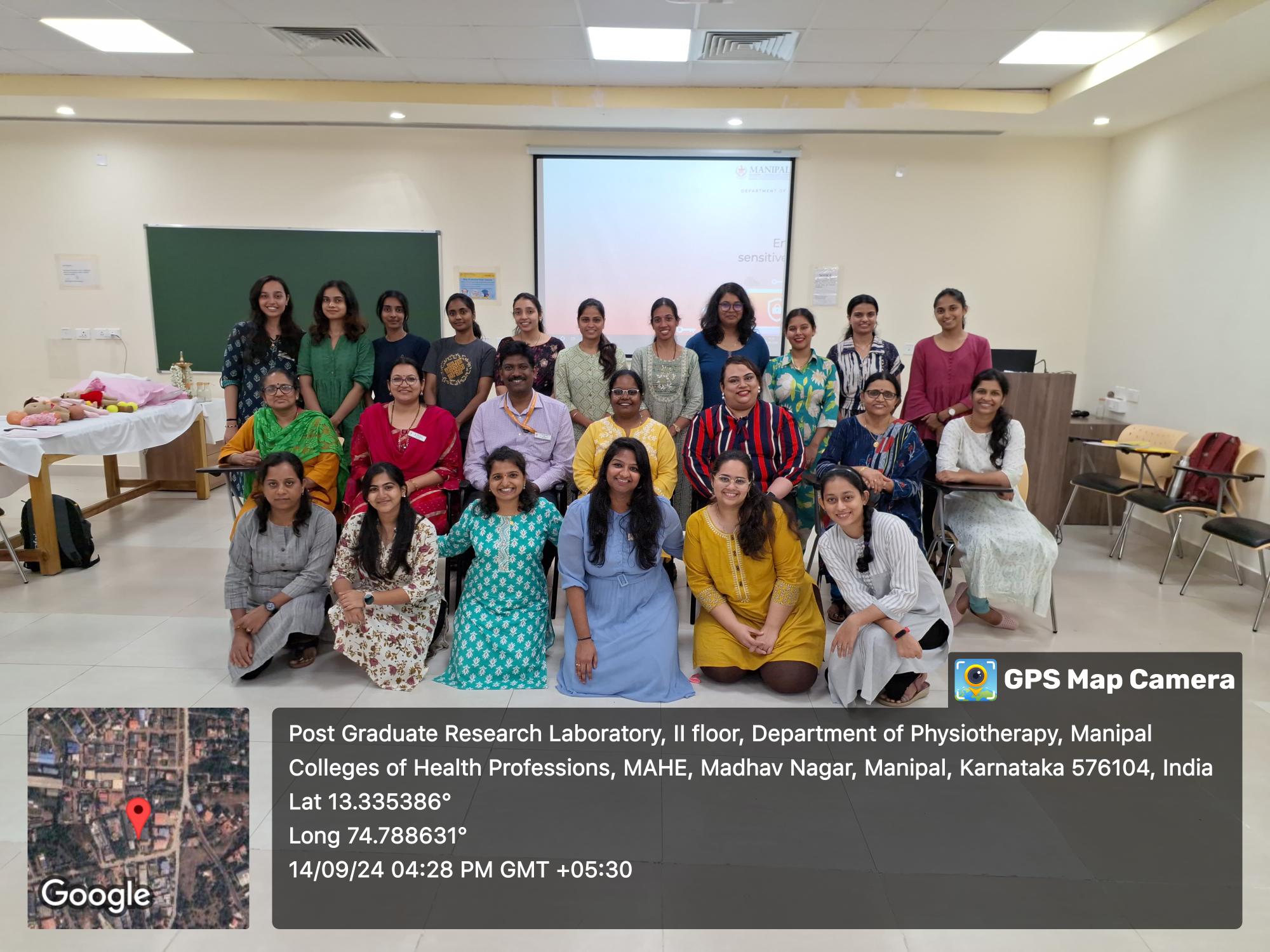 The Department of Physiotherapy, MCHP Manipal organized a two day workshop on "Role of Physiotherapy during Pregnancy, birth and beyond" on the 13th and 14th of September 2024. The inaugural function was presided by Dr G. Arun Maiya, Dean MCHP as Chief Guest and Dr. Akhila Vasudeva, Professor at the Department of Obstetrics and Gynaecology, Kasturba Medical College Manipal as Guest of Honour. The resource persons for the workshop were Dr. Preetha R, Associate Professor, Department of Physiotherapy, MCHP Manipal, Ms. Sriharika Jammula, Assistant Professor, SIMS College of Physiotherapy Guntur, Andhra Pradesh and Ms. Deanne Misquita, Physiotherapist and Lactation consultant at Fernandez hospital -Built for birthing.
