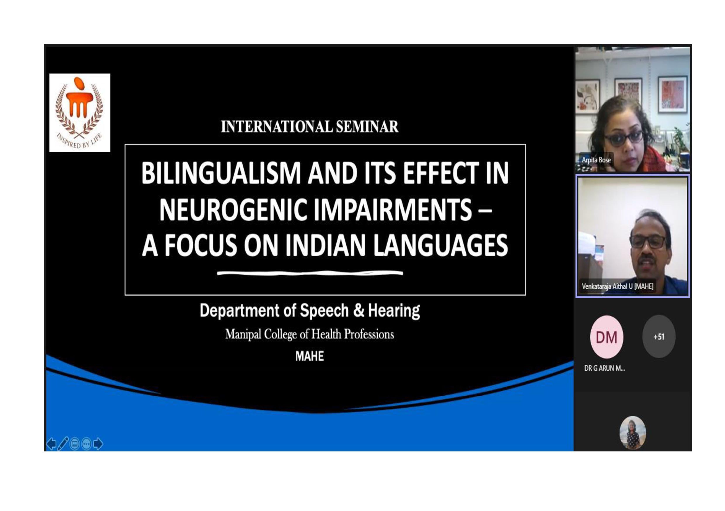 The Department of Speech & Hearing, Manipal College of Health Professions (MCHP), Manipal Academy of Higher Education (MAHE), conducted an online seminar on the topic “Bilingualism and Its effects of Neurogenic Impairments - A focus on Indian Languages” on 19th & 20th of November 2021. The sessions were conducted from 2 pm to 5 pm on both days.